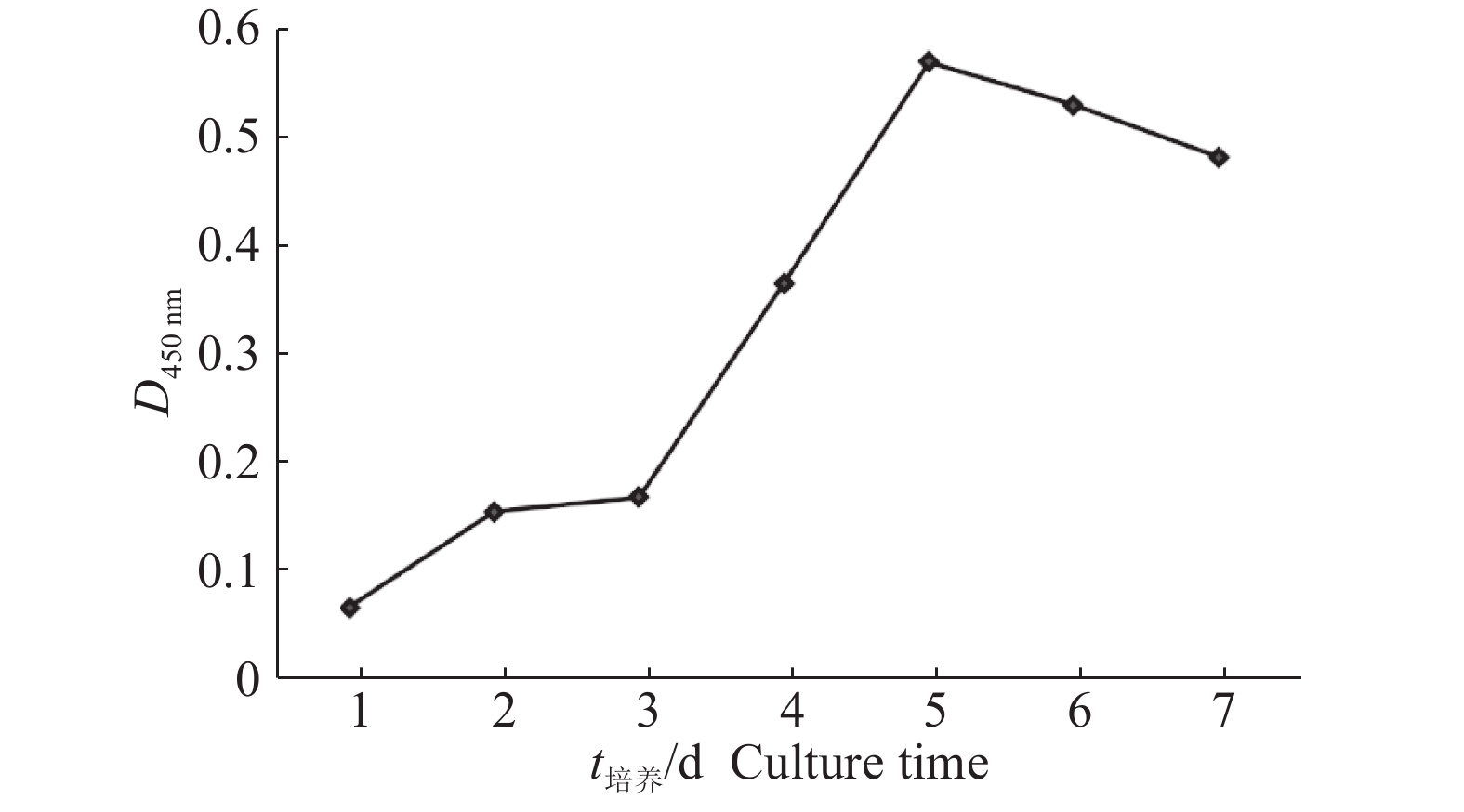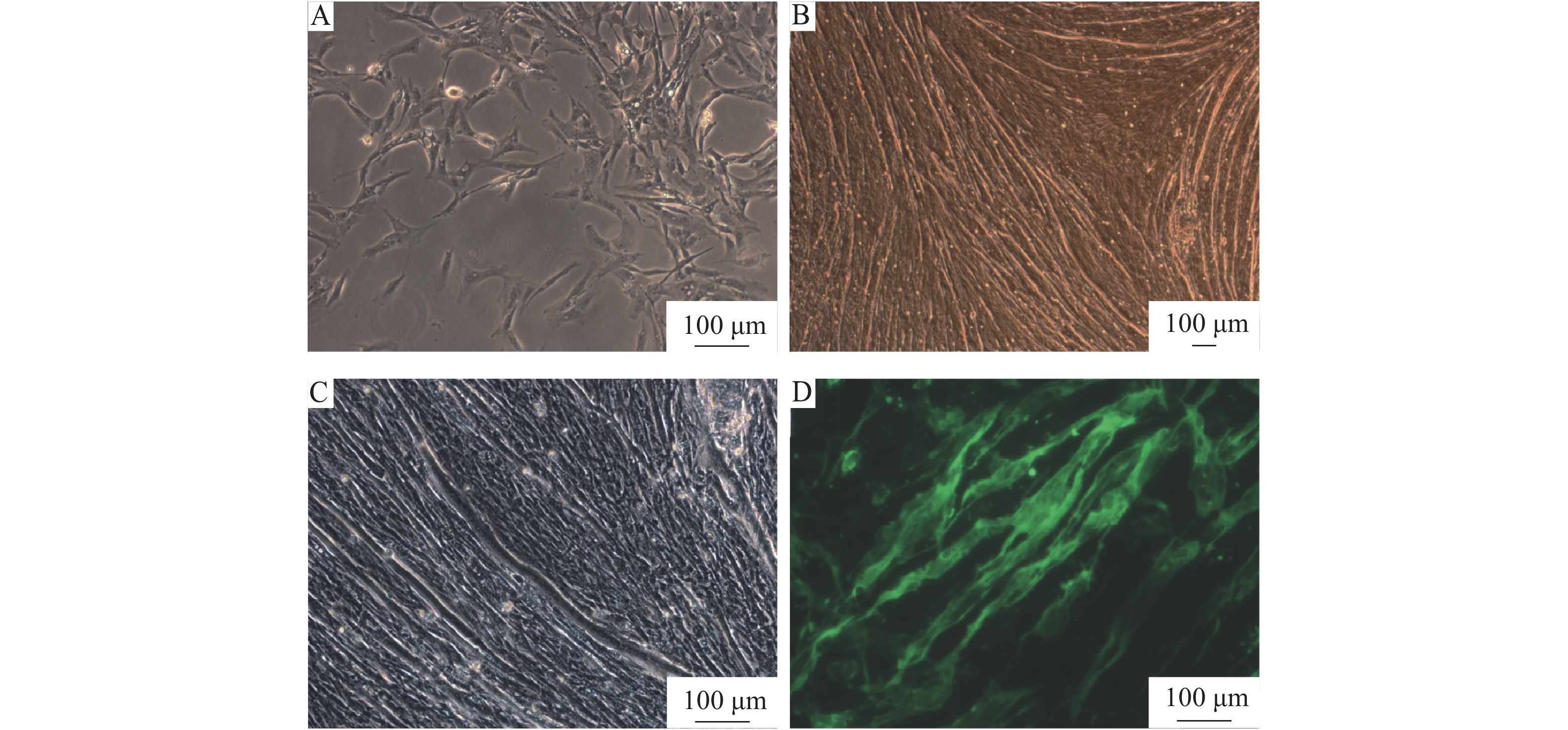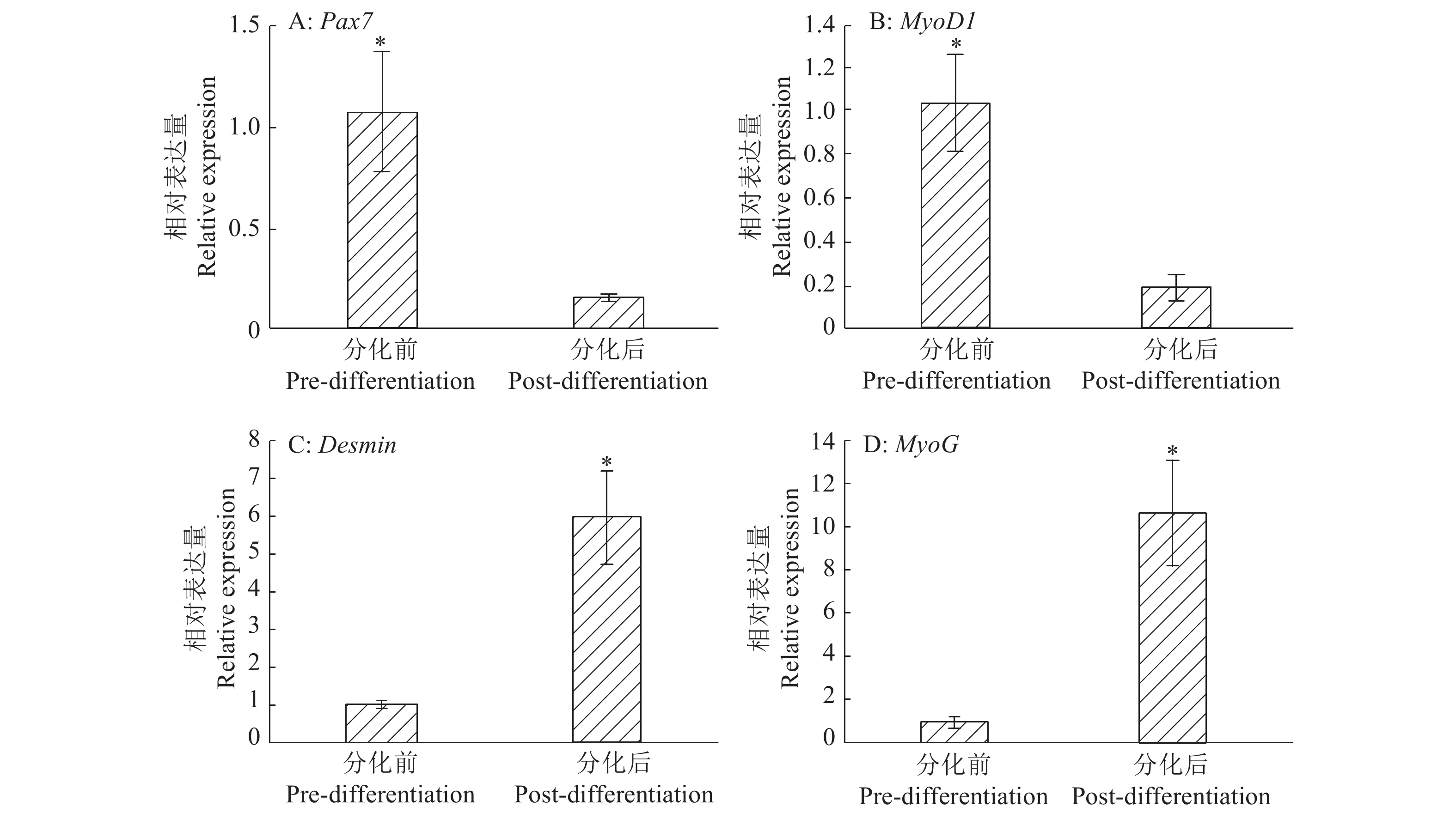 Result Skeletal muscle satellite cells were successfully isolated by the tissue explants adherent method and collagenase method, and cell growth appeared in S-shaped curve. After seven days of culture in high glucose DMEM containing 20% fetal bovine serum(FBS), a large number of visible myotubes were observed, and the myogenic differentiation marker MyHC was expressed in differentiated cells. RT-qPCR results showed that the relative expressions of Desmin and MyoG genes in differentiated myotube cells were 5.68 and 10.38 times of those in skeletal muscle satellite cells before differentiation, while the relative expressions of Pax7 and MyoD1 genes in skeletal muscle satellite cells before differentiation were 7.01 and 5.51 times of those in differentiated myotube cells, respectively.