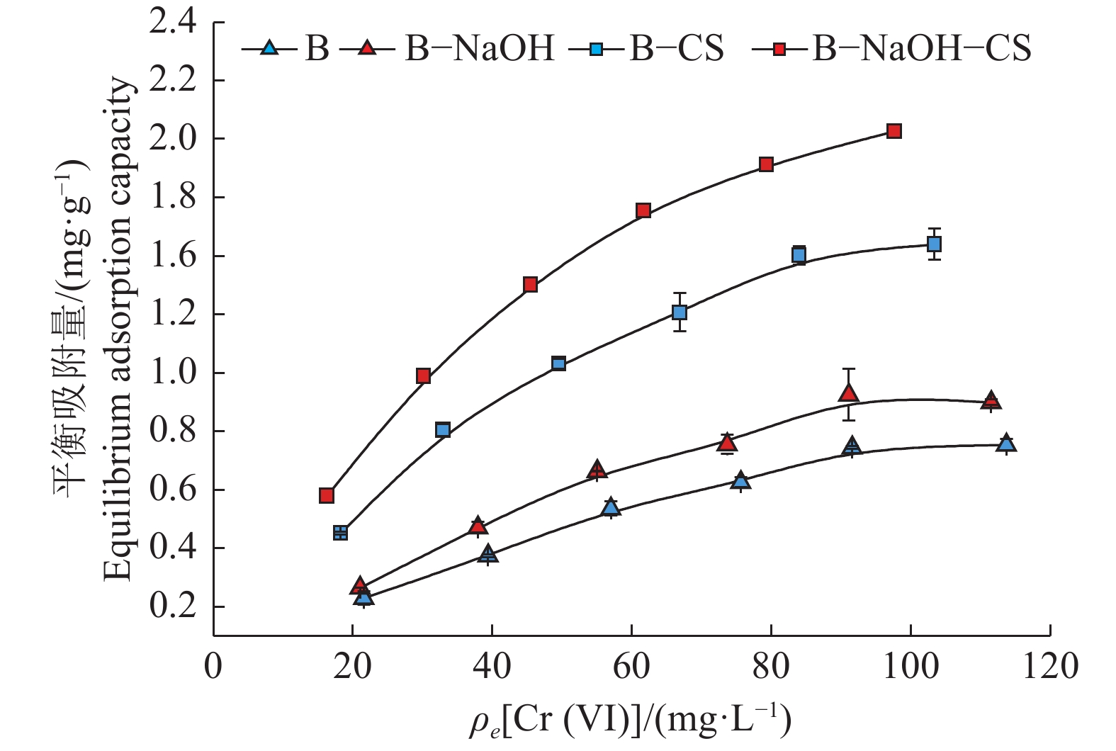 Result A strong N—H absorption peak and an enhanced C—H symmetric bending peak appeared in B-NaOH-CS. The surface sheet structure of B-NaOH-CS was curly dispersed, the interlayer pores increased, and the specific surface area was 1.2 times more than other bentonite. When the concentration of Cr (VI) was 50 mg·L−1, the equilibrium adsorption capacity of B-NaOH-CS for Cr (VI) was 1.03 mg·g−1, which was 1.84 and 1.26 times of B-NaOH and B-CS respectively. The quasi-second-order kinetic equation and Langmuir equation could more accurately describe adsorption process of bentonite for Cr (VI). Thermodynamic parameters of △H>0, △G<0 and △S>0 indicated the adsorption process of bentonite for Cr (VI) was endothermic, spontaneous and disordered. B-NaOH had the maximum adsorption capacity for Cr (VI) at pH = 7.0, while B-CS and B-NaOH-CS at pH = 3.0.