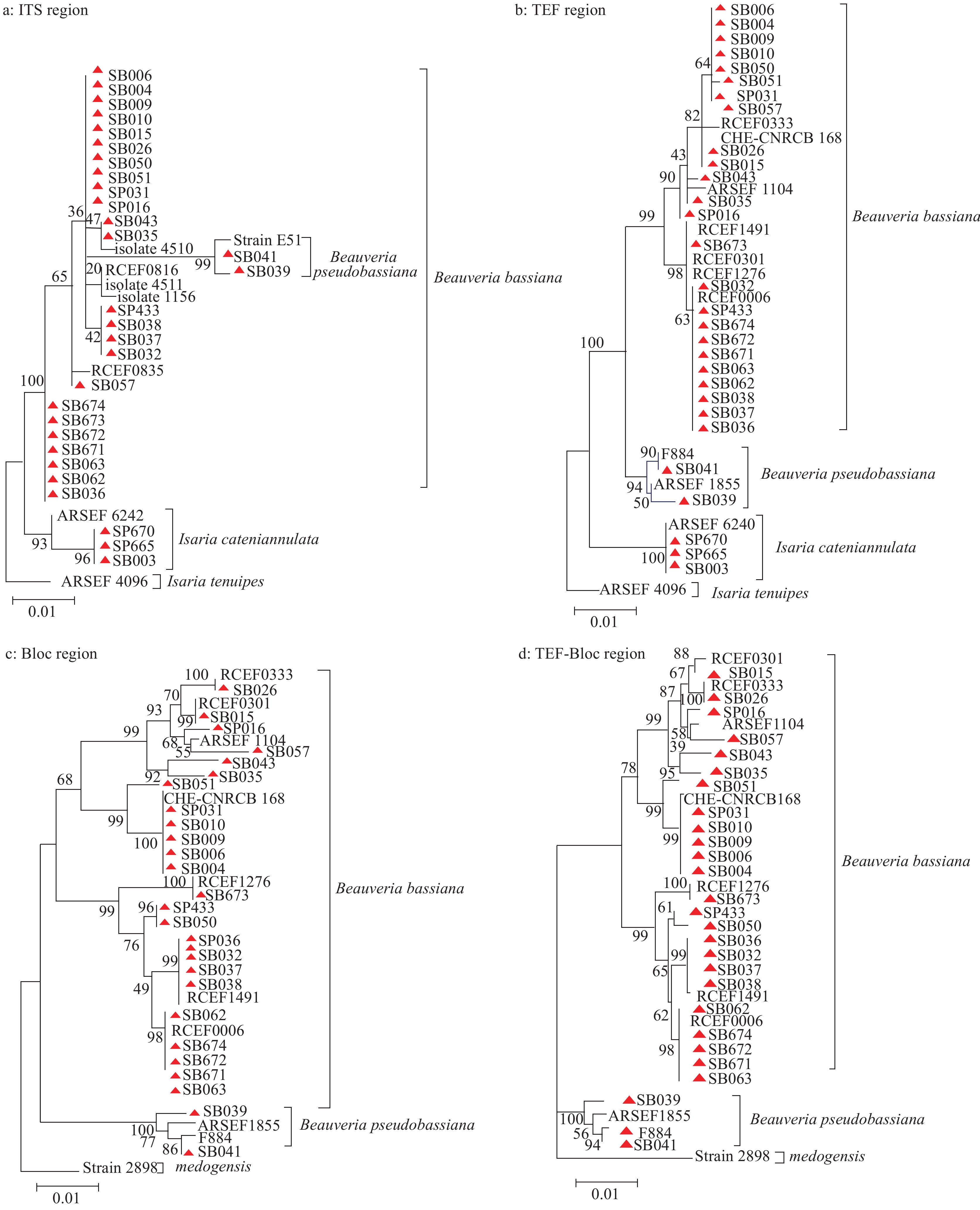 Result Twenty-six of 29 entomogenous fungal strains had the characteristics of Beauveria and the other three strains of SB003, SP665 and SP670 were identified as Isaria. Phylogenetic tree was constructed using TEF region sequence, Bloc region sequence and TEF-Bloc combined sequence, which showed that 29 strains included 24 strains of Beauveria bassiana, 2 strains of B. pseudobassiana, and 3 strains of Isaria cateinannulata. The mortality of the 2nd instar nymph of B. tabaci increased with the increase of spore concentration, and the pathogenicity of different strain was different. The 2nd instar nymphs of B. tabaci were treated with 1×108 mL−1 spore suspension for 7 days, and the SP433 strain had the highest lethality rate of 87.37%, followed by SB009 with a lethality rate of 82.93%.