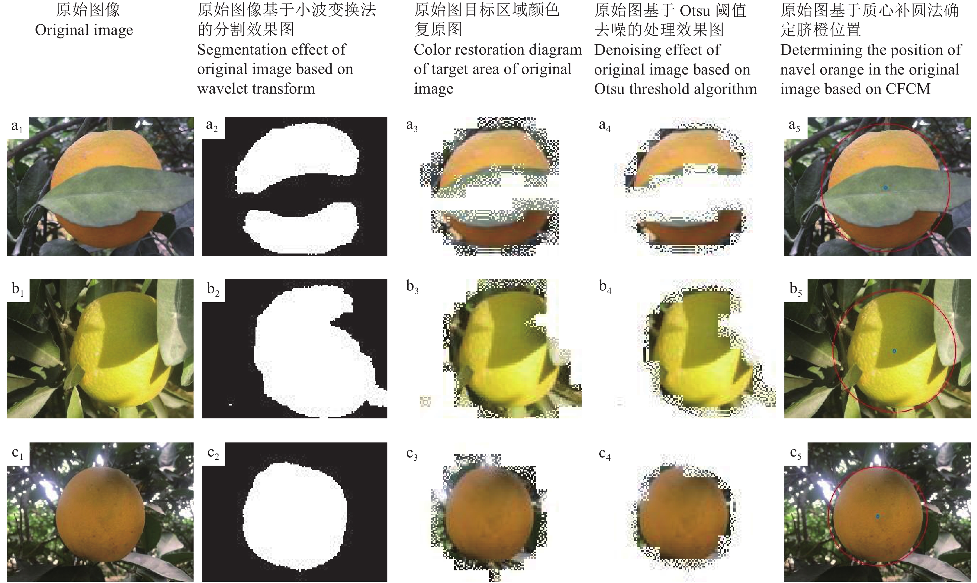 Method A navel orange recognition method based on wavelet transform and Otsu threshold denoising was proposed. Firstly, we chose a better contrast and established the YCbCr model with color space helpful for image segmentation. Then we designed a navel orange detection algorithm based on Otsu threshold denoising and reduced noise interference in the segmentation region of navel orange. Finally we proposed a circle filling method based on the center of mass to determine the position of navel orange in the image, and the detection result was displayed in the original image.