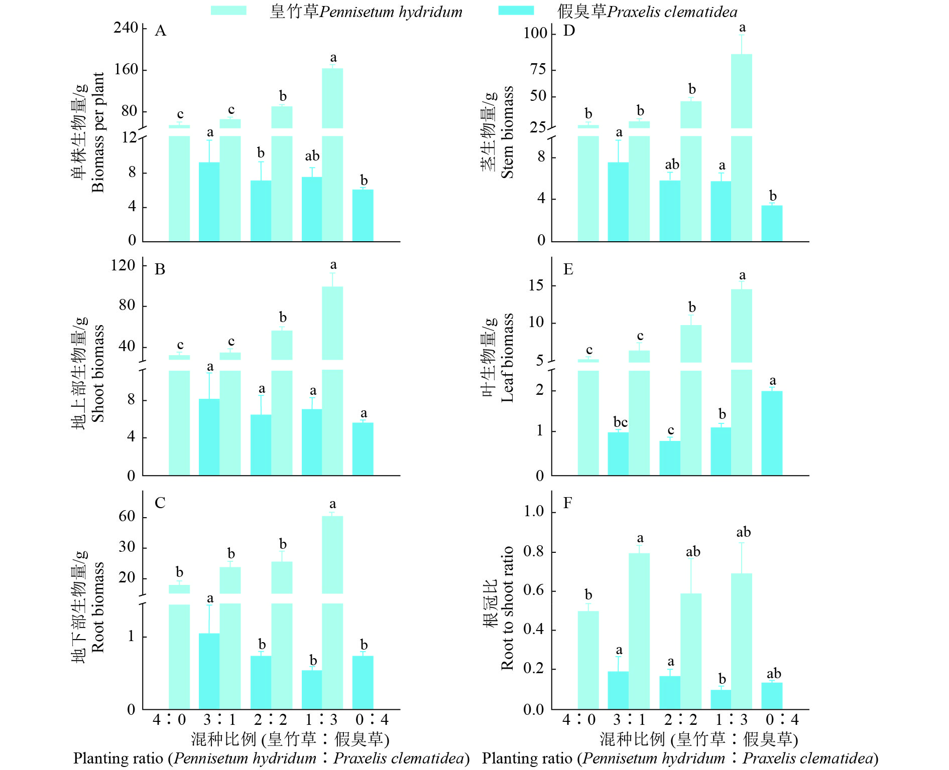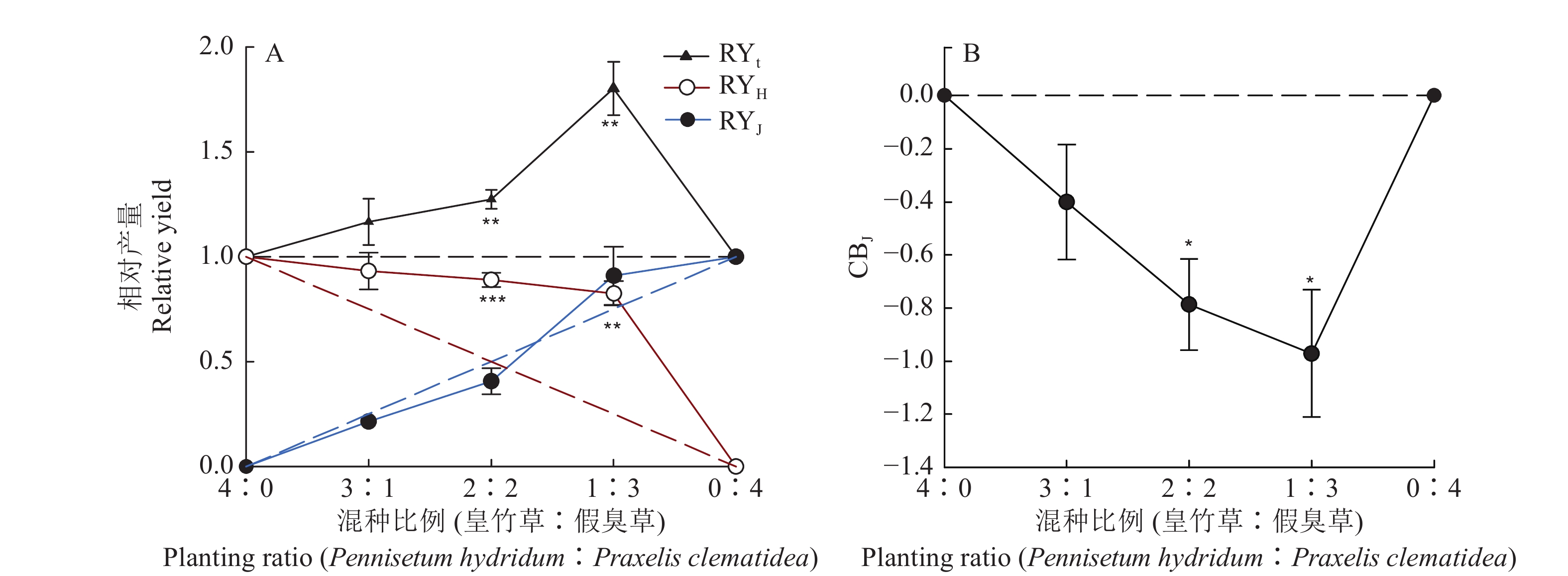 Method Pot experiment with a series of planting ratios of Pennisetum hydridum and Praxelis clematidea was conducted. Competitive indices and morphological traits of two plant species were measured.