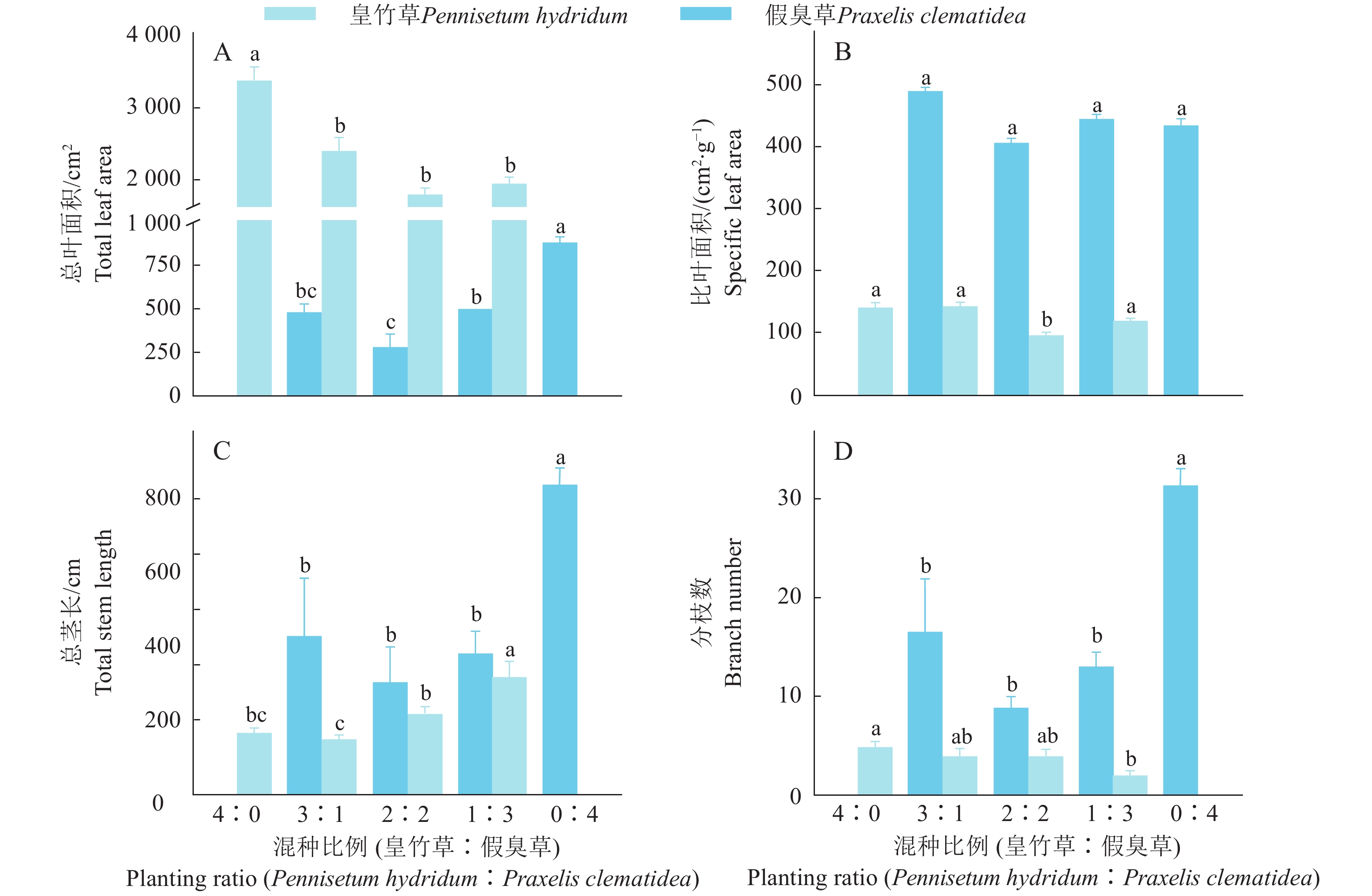 Result Competitive balance indices of Praxelis clematidea ranged from −0.97 to −0.40, lower than zero in all treatments with different planting ratios, indicating Pennisetum hydridum had a competitive dominance. The biomass per plant of Pennisetum hydridum increased from 48.98 g to 161.66 g with increasing ratio of planted Praxelis clematidea. Mixing two plant species suppressed growth and development of stem and leaf for Praxelis clematidea, and resulted in that total leaf area, total stem length and branch number per plant of Praxelis clematidea decreased by 43.4%−68.2%, 49.4%−63.6% and 46.1%−71.6% respectively compared with those in monoculture of Praxelis clematidea.