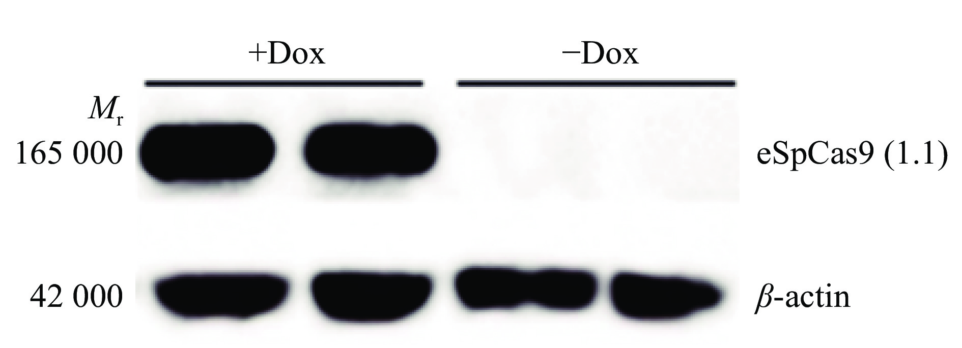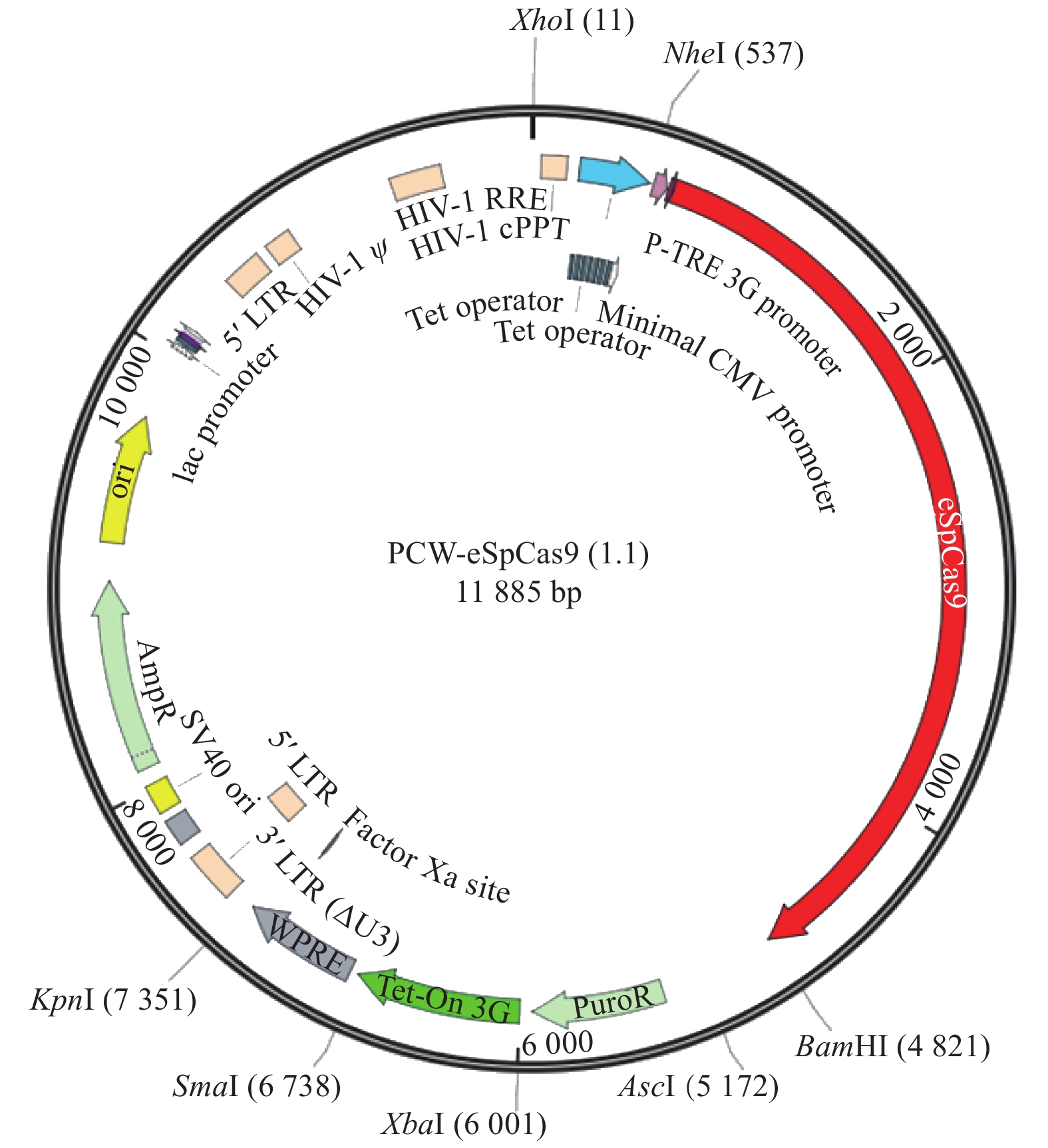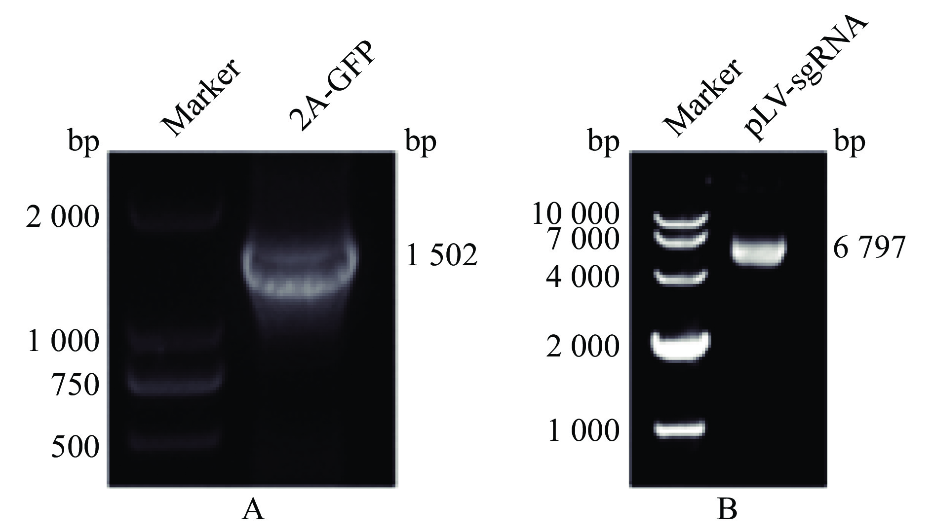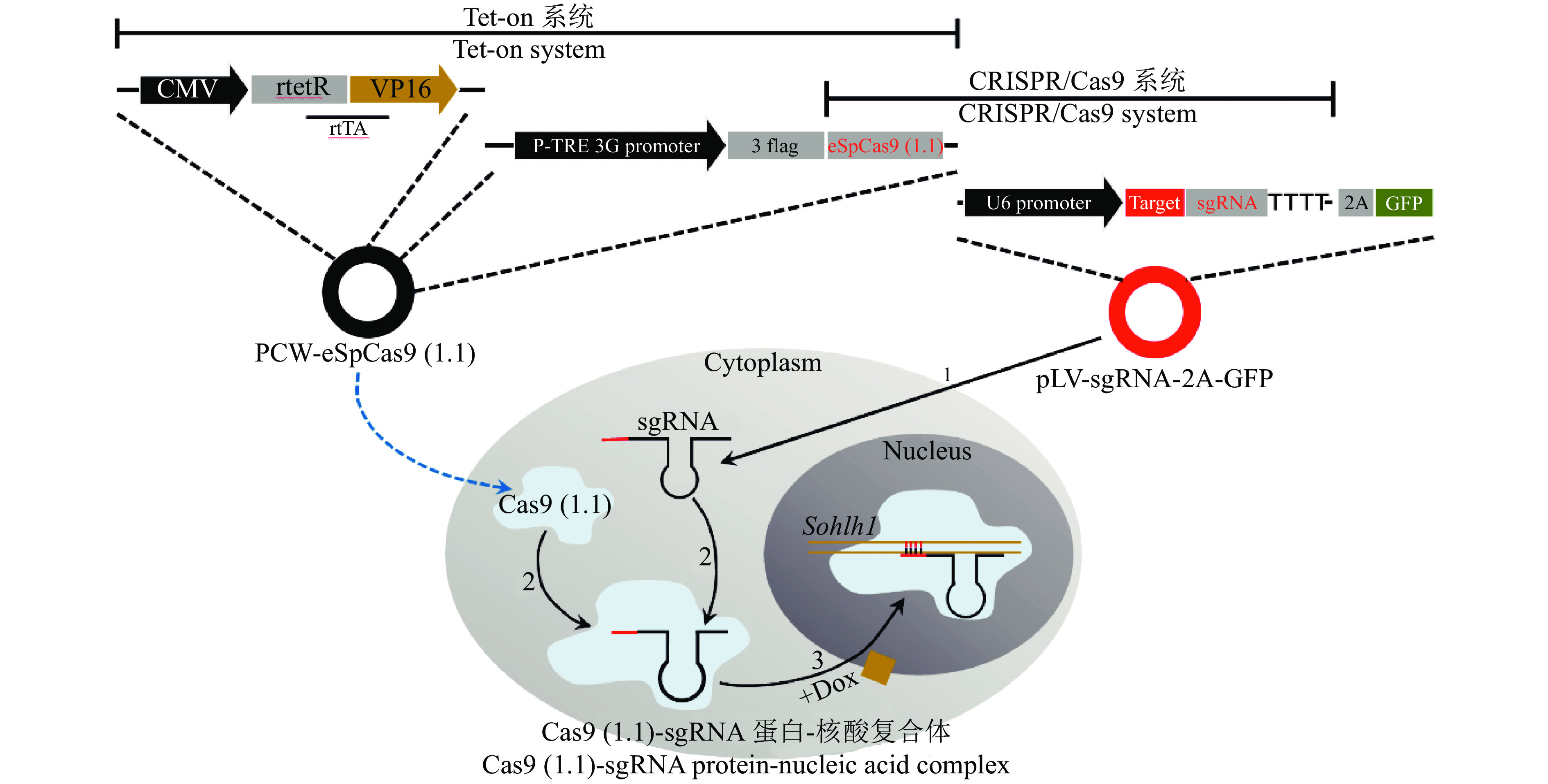 Method Porcine fetal fibroblast (PFF) was isolated and cultured for infection with lentiviral vector PCW-eSpCas9(1.1), screened by 1 μg/mL purinomycin and induced by doxycycline (Dox). The pLV-sgRNA vector was modified and transfected with 293FT cells for validation. The pLV-sgRNA-2A-GFP specific vector containing Sohlh1 gene target was constructed for lentivirus packaging detection. PCW-eSpCas9(1.1) PFF cell was transfected by package virus infection and screened by 3 μg/mL blasticidin, followed by Dox induction for expression analysis and knockout efficiency detection.