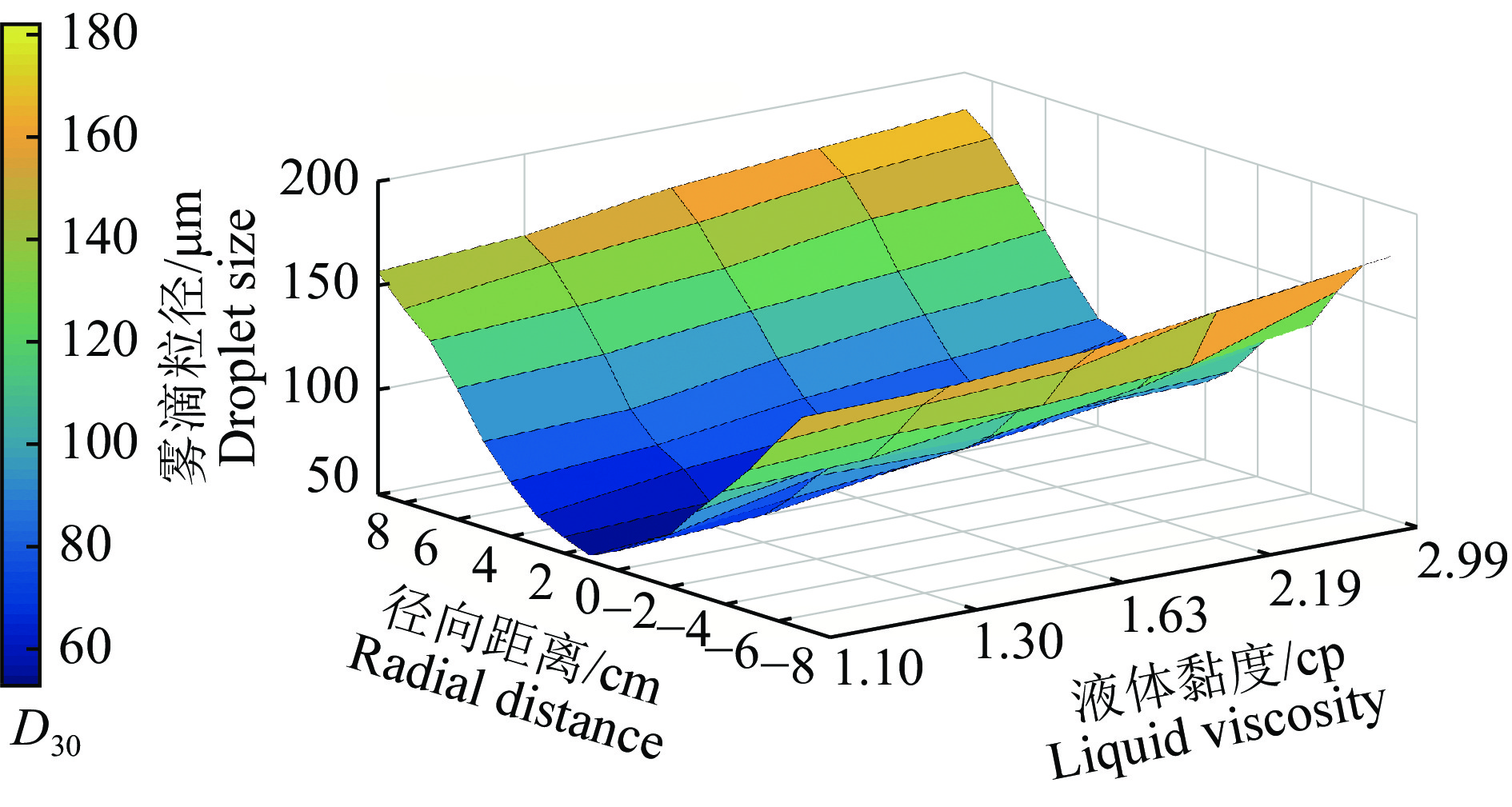 Result In the axis direction of the spray area of the nozzle, arithmetic mean diameter, volume mean diameter, and Sauter mean diameter showed the law of first becoming smaller and then gradually increasing. The disturbance of the external air resistance made a certain pattern of surface waves on the surface of the ejected liquid. As the distance increased, the amplitude of the waves became larger, and the wave crests were torn off and broken into small droplets. Then under the action of gravity, the droplets collided and aggregated, and the droplet size gradually increased. In the radial direction of the spray area of the nozzle, the droplets were approximately symmetrically distributed, and the size of the droplets was small in the middle and large on the two sides. With the increase of the radial distance, the size of the droplets gradually increased. SPSS analysis showed that in the axial direction of the spray area the correlation coefficients of axial distance, liquid viscosity with droplet size were 0.531 and 0.795 respectively. In the radial direction the correlation coefficients of radial distance, liquid viscosity with droplet size were 0.932 and 0.328 respectively.