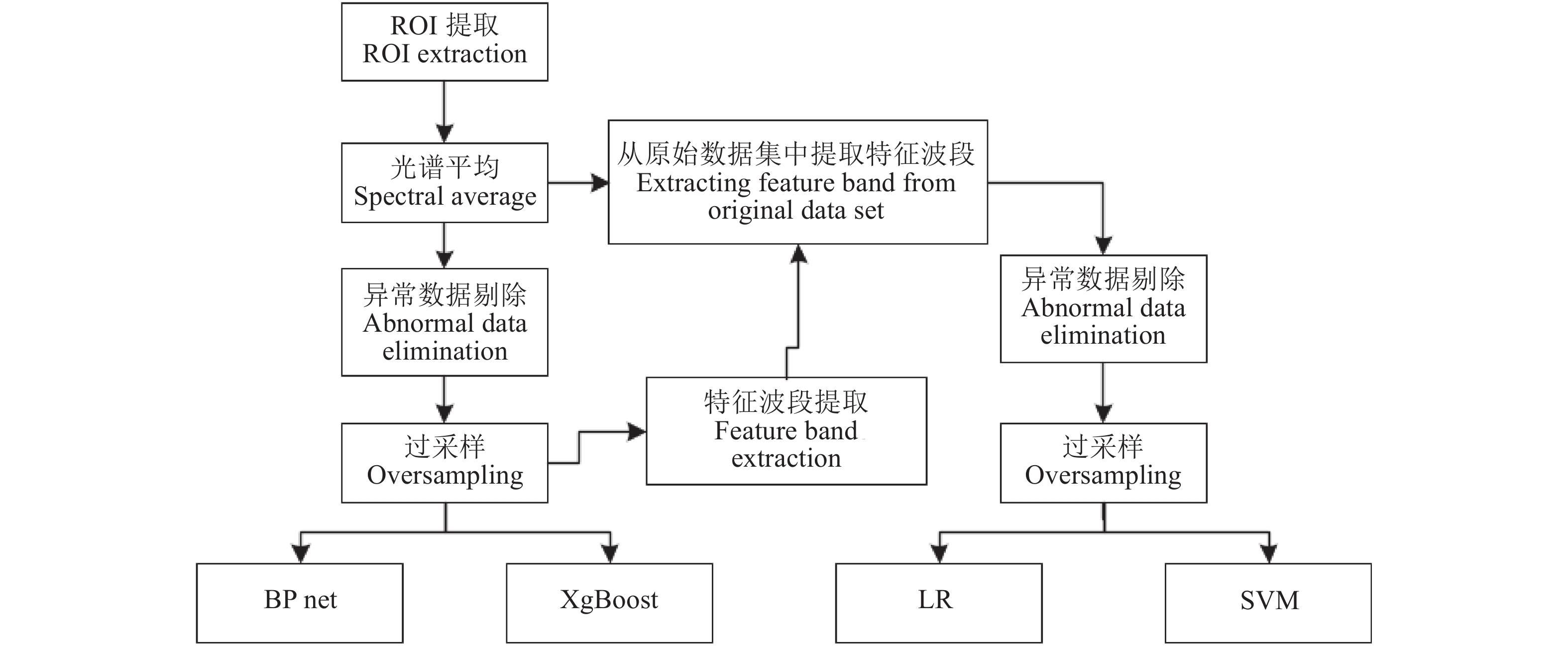Result The AUC scores of BP neural network and XgBoost were 0.8830 and 0.9120 respectively, and the accuracy rates of both methods were over 95%. The feature wavelength combination of 698 and 762 nm was extracted. Based on this characteristic band, the recall rates of logistic regression and support vector machine algorithm were 93.00% and 96.00% respectively.
