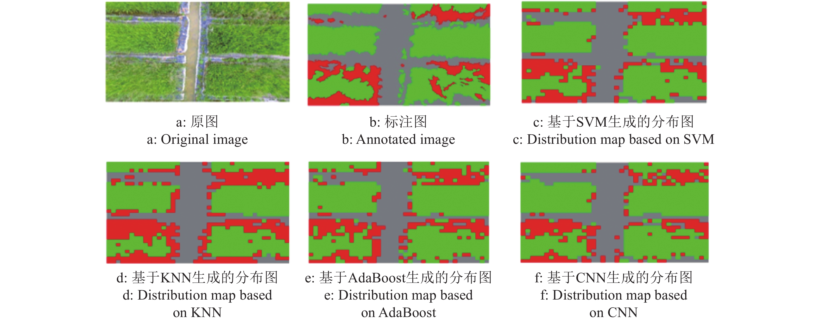 Result The run time of test set based on SVM, KNN and AdaBoost were 0.500 4, 2.209 2 and 0.411 1 s, and the classification accuracies were 89.75%, 85.58% and 90.25% respectively; The classification accuracy of image based on CNN was 92.41%, which was higher than those of three machine learning algorithms. All machine learning algorithms and CNN could effectively recognize rice and weed, acquire weed distribution information, and generate distribution map of weed in rice field.