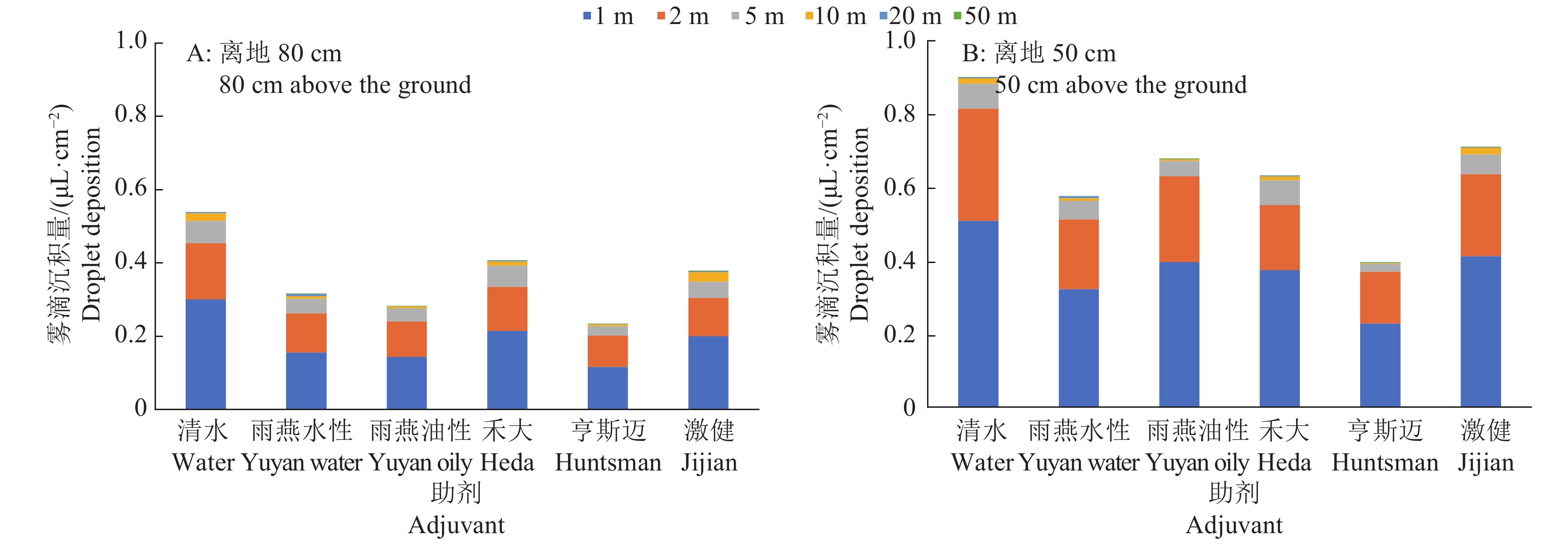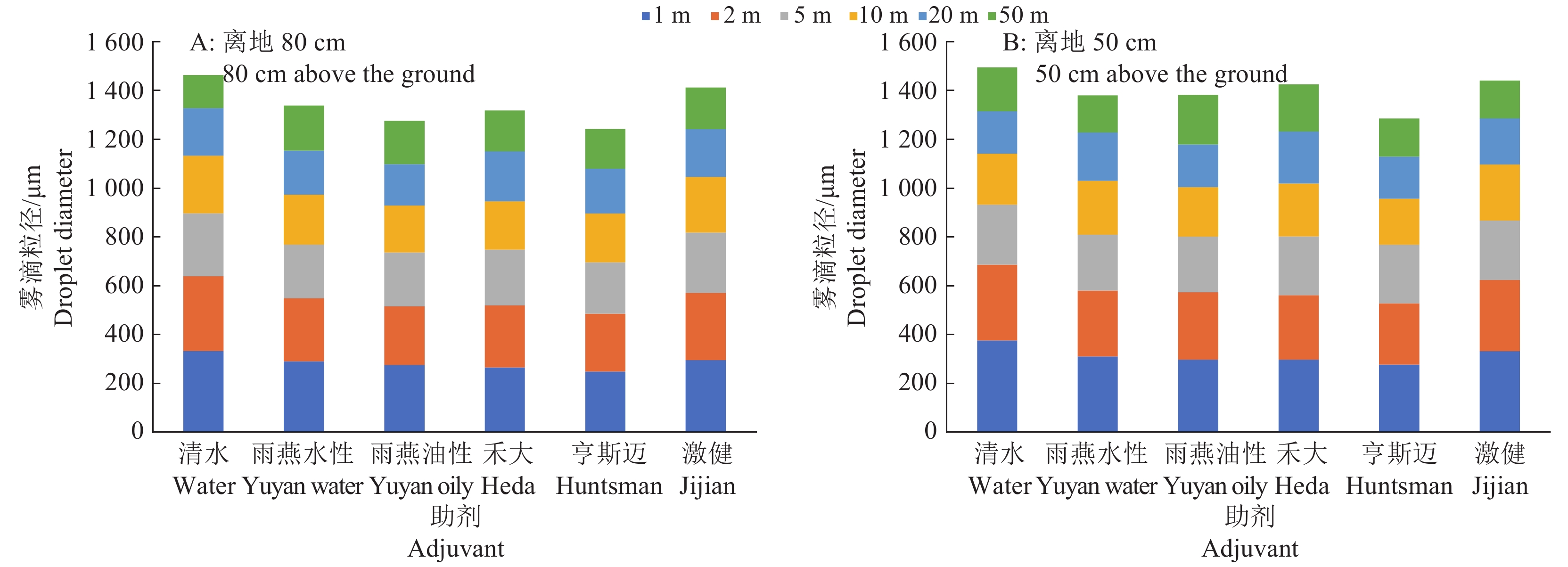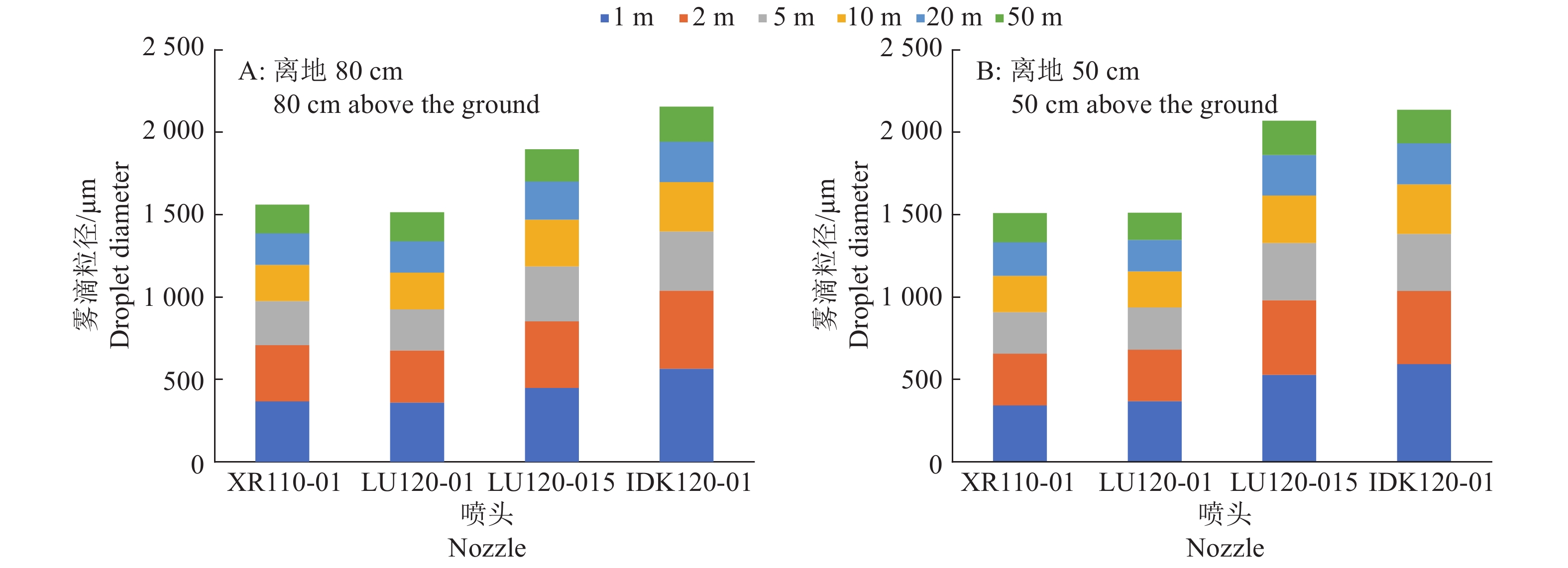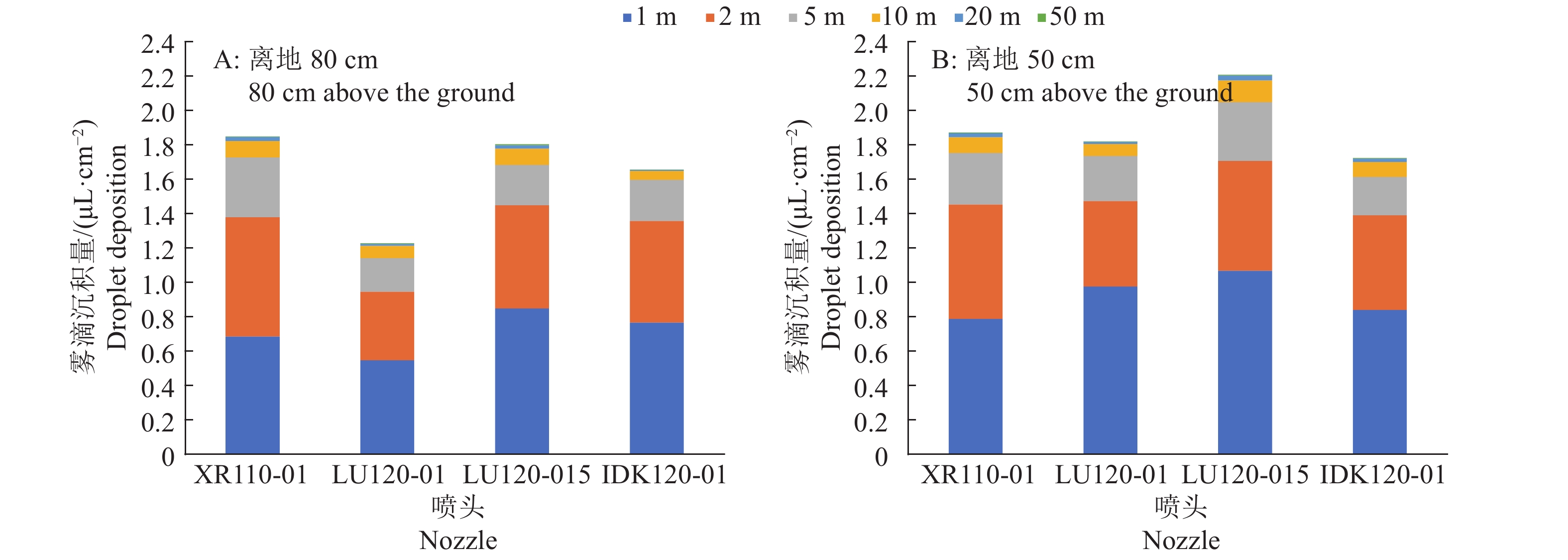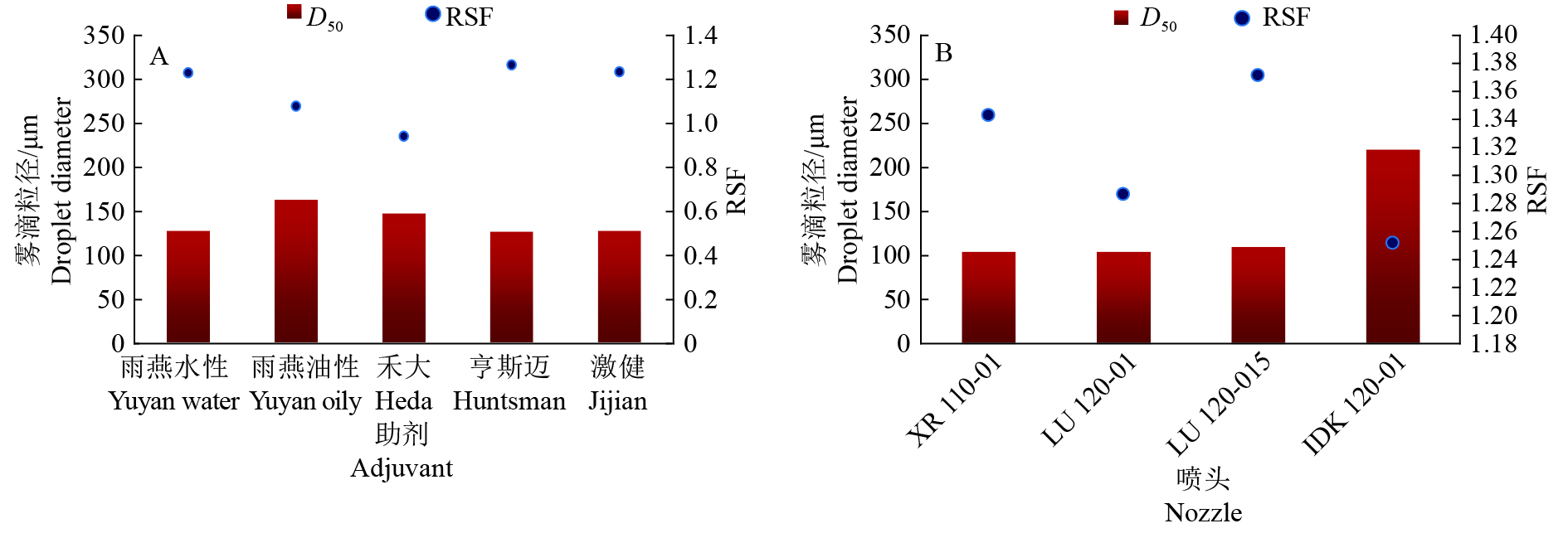 Result In the lab spraying experiments, the solutions of Yuyan oily and Heda adjuvants (φ=1%) showed better effect on increasing droplet size. The IDK 120-01 nozzle increased droplet size most significantly. In the field test, compared with clear water control, all adjuvants reduced drift, most droplets were within two meters of the spraying route. The amount of droplets at 80 cm above the ground was 40%–60% less than that at 50 cm above the ground. Yuyan oily adjuvant had more deposition in the target area. The IDK 120-01 nozzle showed the most deposition in the target area with less droplet number per unit area.