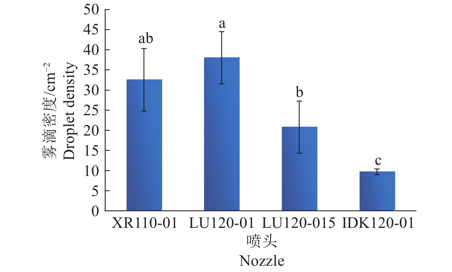 Method The droplets were dyed by pigment staining. DJI MG-1S was used for spraying. The droplet reception cards were collected, scanned and analyzed. The solutions of different adjuvants (φ=1%) and different nozzles were used to compare the influences of adjuvant and nozzle on distribution of droplets.