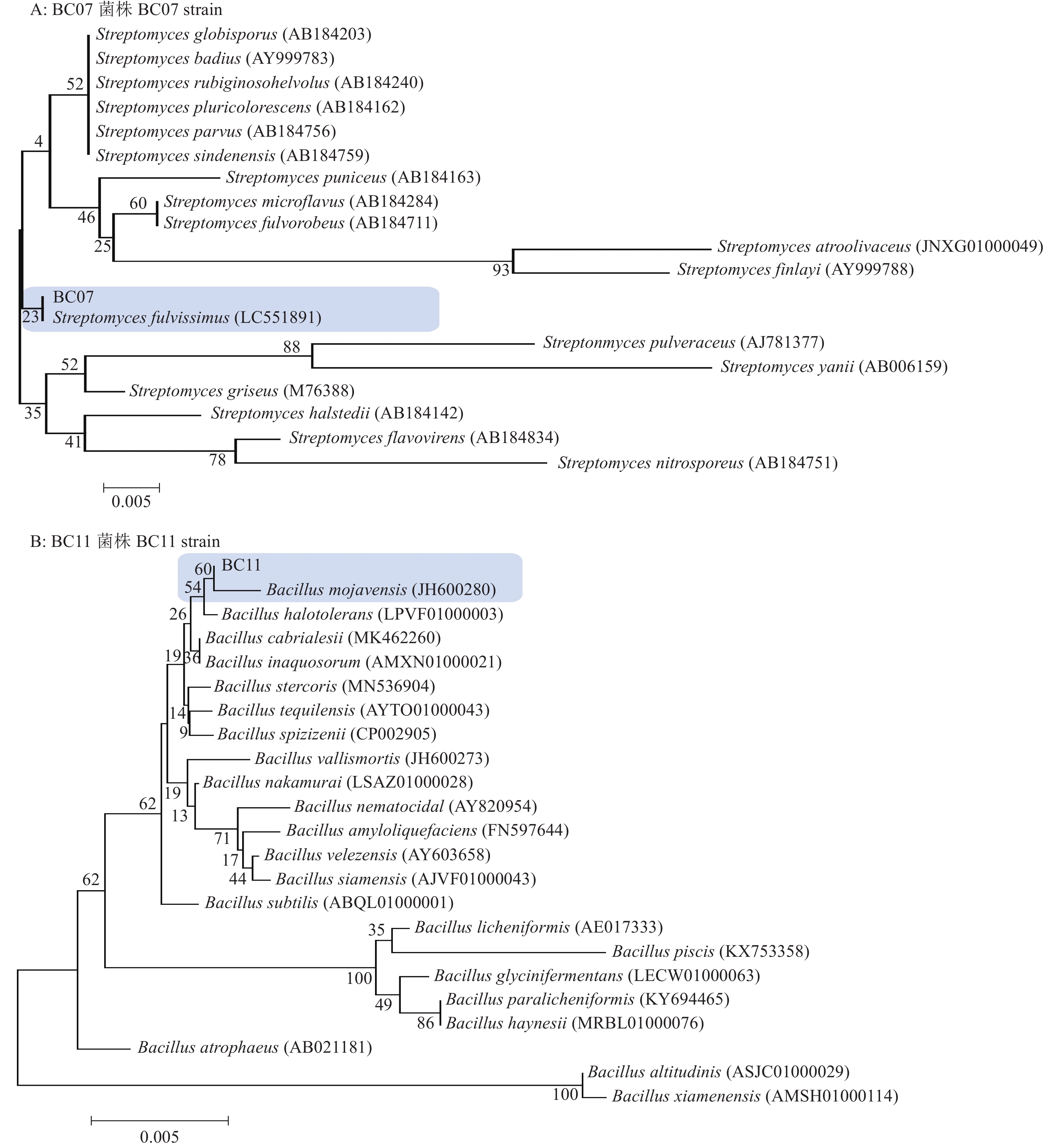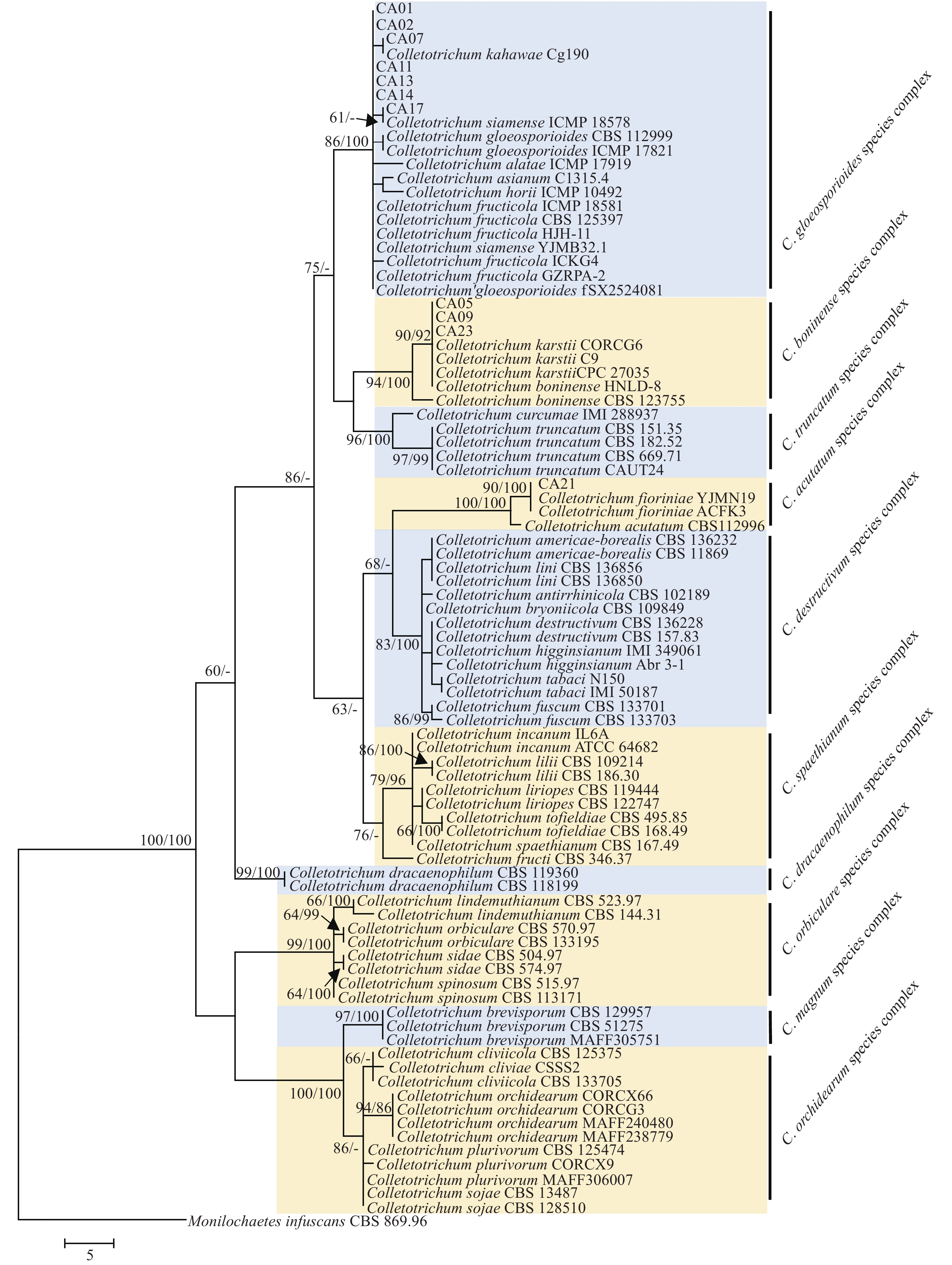 Result C. oleifera anthrax occurred seriously in Dehong Prefecture of Yunnan Province, with an average incidence rate of 56.18% and a disease index of 53.11. Five major strains were identified from Yunan Province including Colletotrichum gloeosporioides,C. kahawae, C. karstii, C. fiorniae and C. siamense. Among them, C. gloeosporioides was the dominant pathogen, and strain CA17 (C. siamense) had the strongest pathogenicity on living leaves of C. oleifera. The results of plate confrontation method indicated that Streptomyces fulvissimus and Bacillus mojavensis isolated from healthy C. oleifera in Dehong had good antagonistic effect on CA17, and the inhibition rates were 37% and 42% respectively.