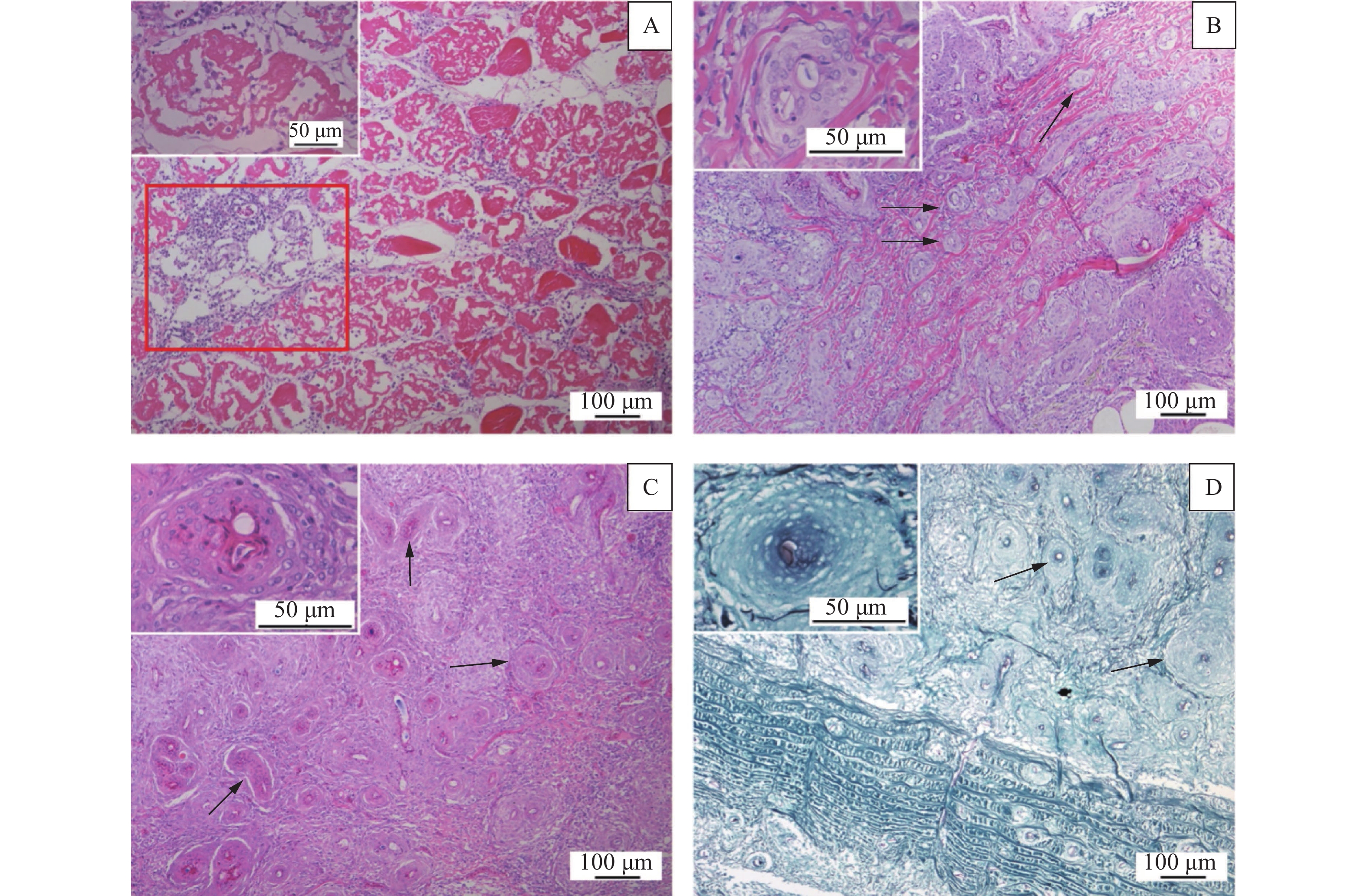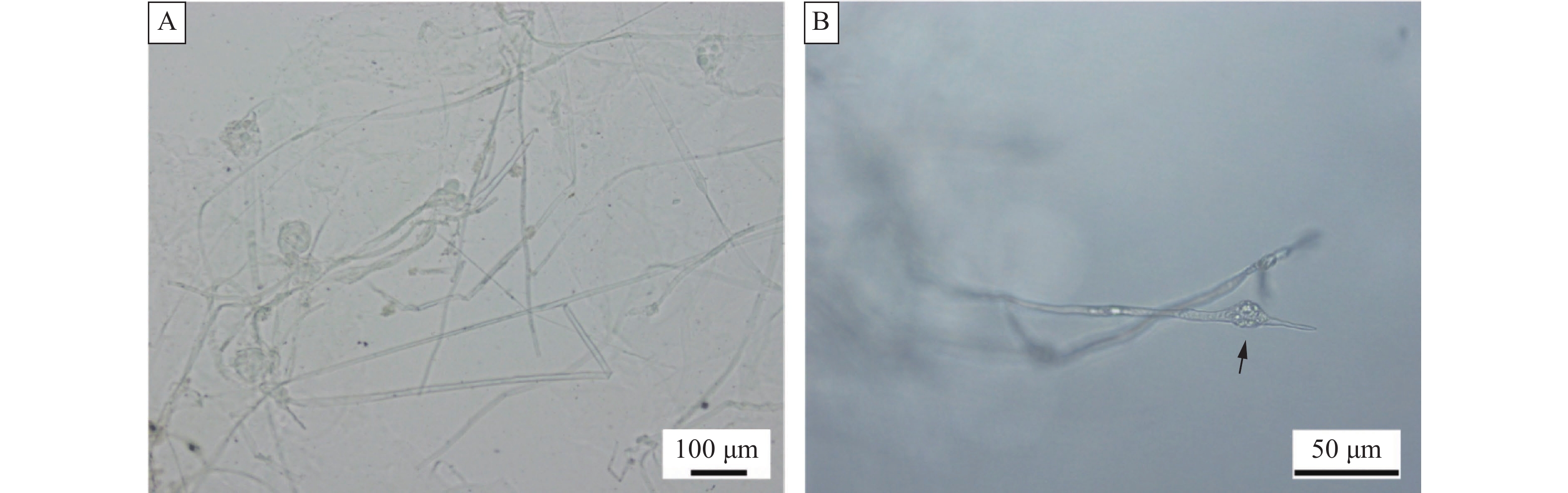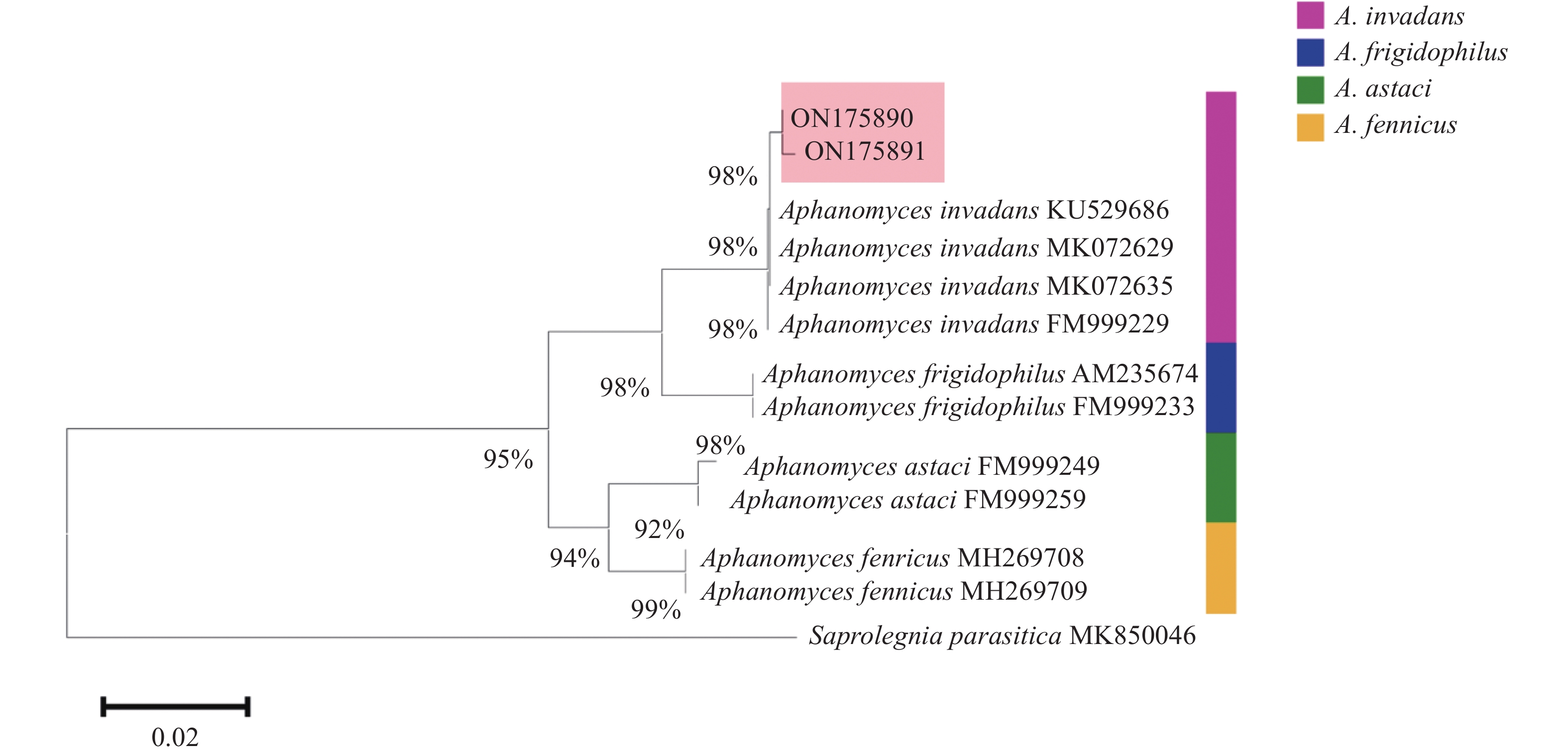 Result A large number of long filamentous and less-branched mycelia with 10−30 μm diameter were observed in the ulcerated tissues. Pathologically, we observed necrosis or lysed muscle fibers, inflammatory cell infiltration in the muscle tissue, and distribution of numerous fungal granulomas consisting of epithelioid cells, fibroblasts, and central located mycelia in the lesion tissues. By using periodic acid-silver metheramine (PASM) staining, the mycelia in the fungal granulomas center displayed black colour. We confirmed the infection of Aphanomyces invadans in the lesion muscle tissues by PCR using species-specific primers that target the ITS gene of A. invadans. The A. invadans (BW1 and BW3) pure cultures were isolated by glucose and peotone (GP) agar and then incubated in sterilized pond water. Prosporangium formation was observed in the culture after 12 h incubation period, which was consistent with the characteristics of Aphanomyces. Based on ITS gene sequencing of BW1 and BW3, their ITS genes were found to have 99.64% and 99.46% sequence similarities with A. invadans, and the two strains clustered with A. invadans in the phylogenetic tree.