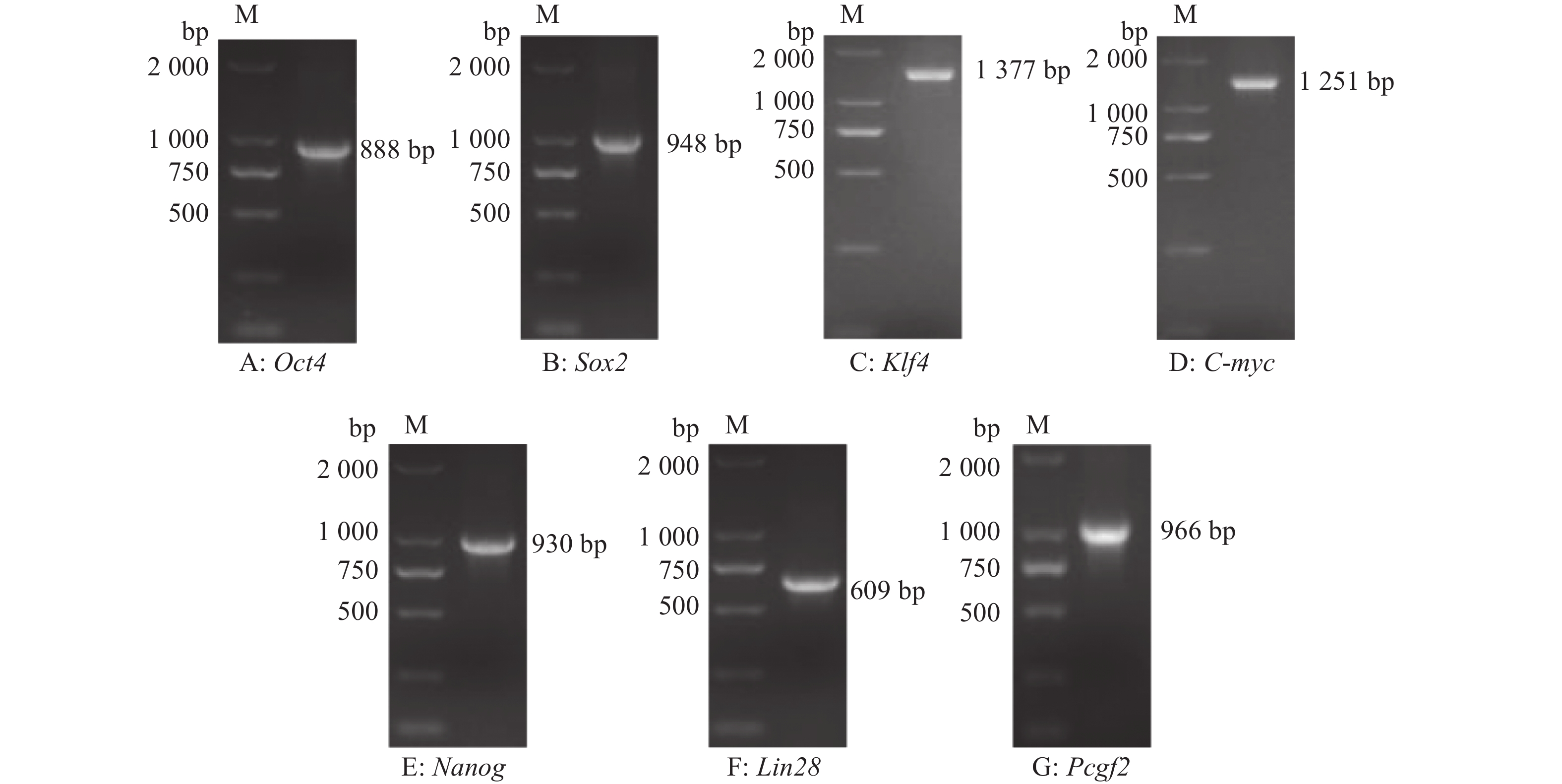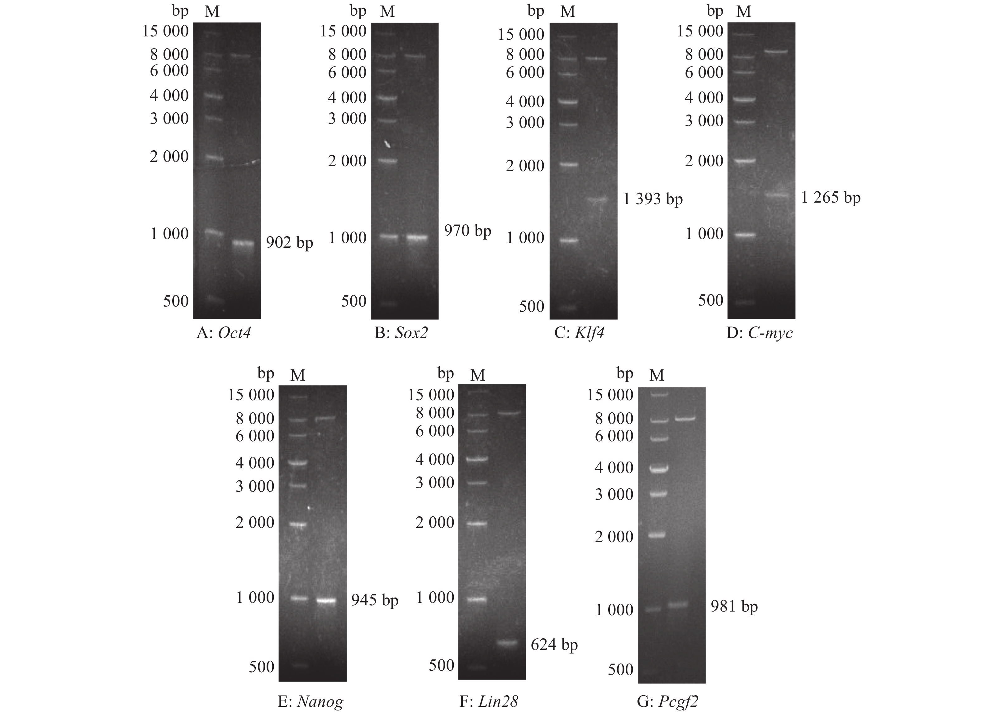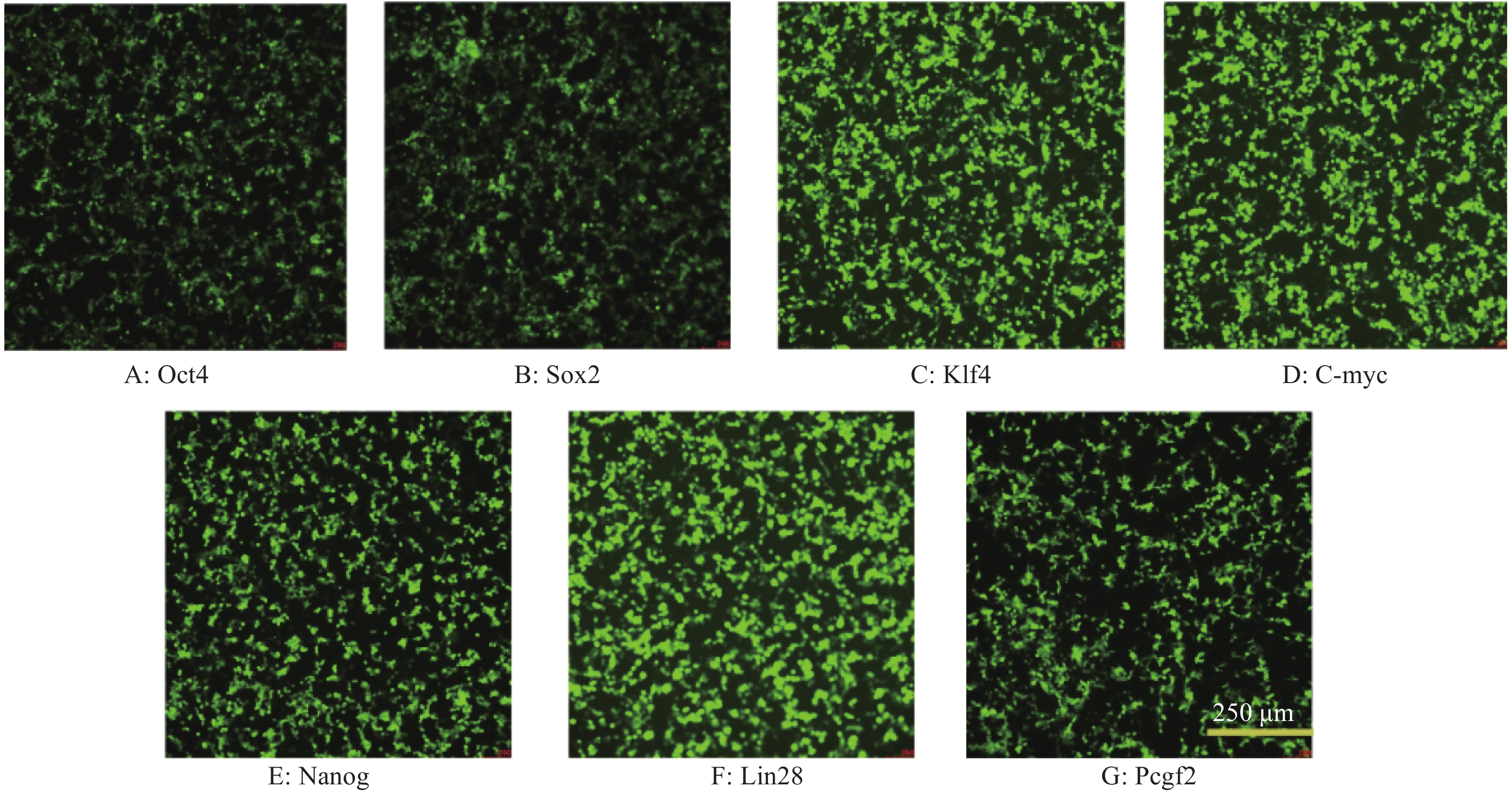 Method Six conventional reprogramming factors including Oct4, Sox2, Nanog, Lin28, C-myc and Klf4 as well as Pcgf2 gene were amplified and reconstituted with lentiviral vectors as lentiviral plasmids using chicken early embryos as templates. After packaging the lentivirus and measuring the corresponding viral titers, chicken embryonic fibroblasts were infected in groups and stem cell markers were assayed during the induction process.
