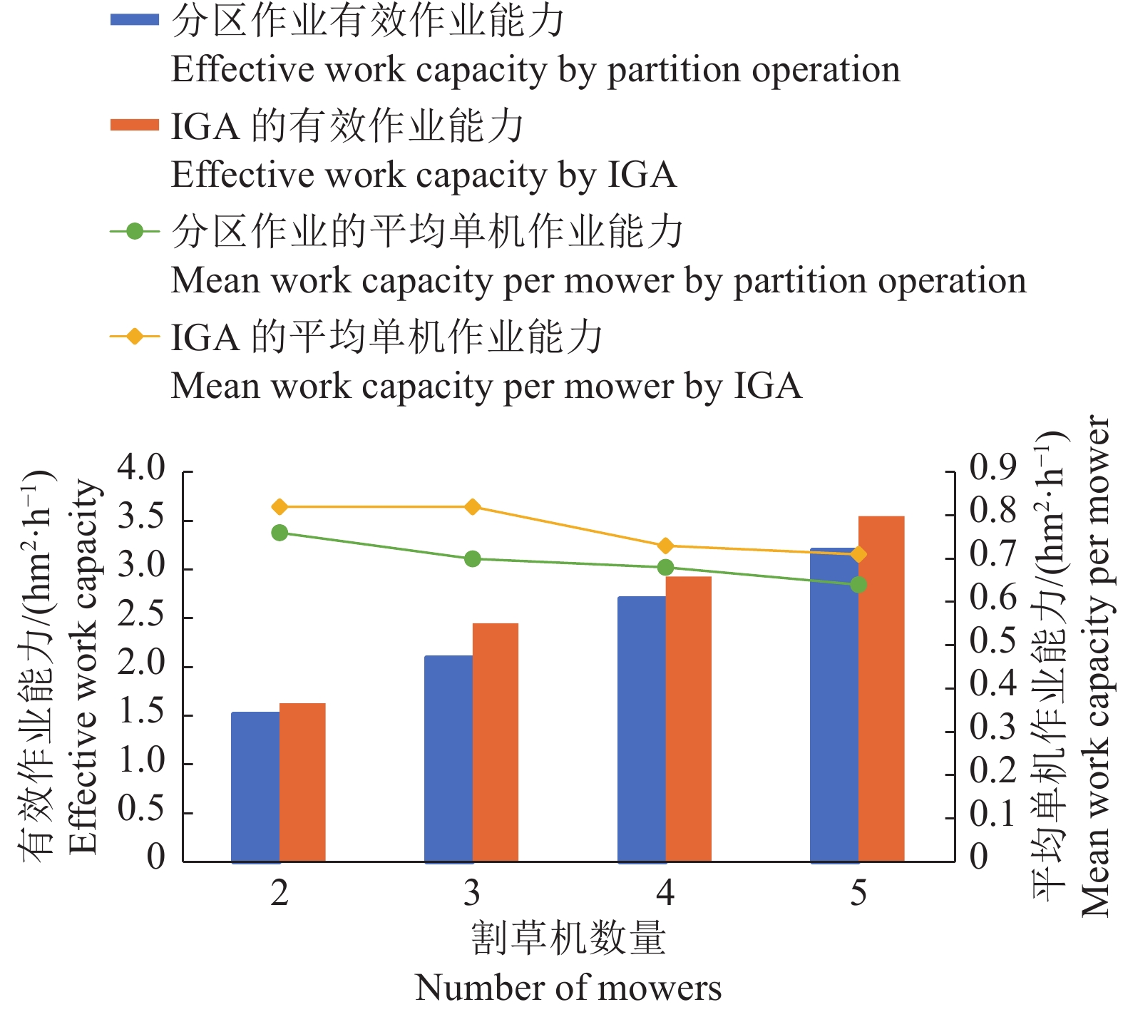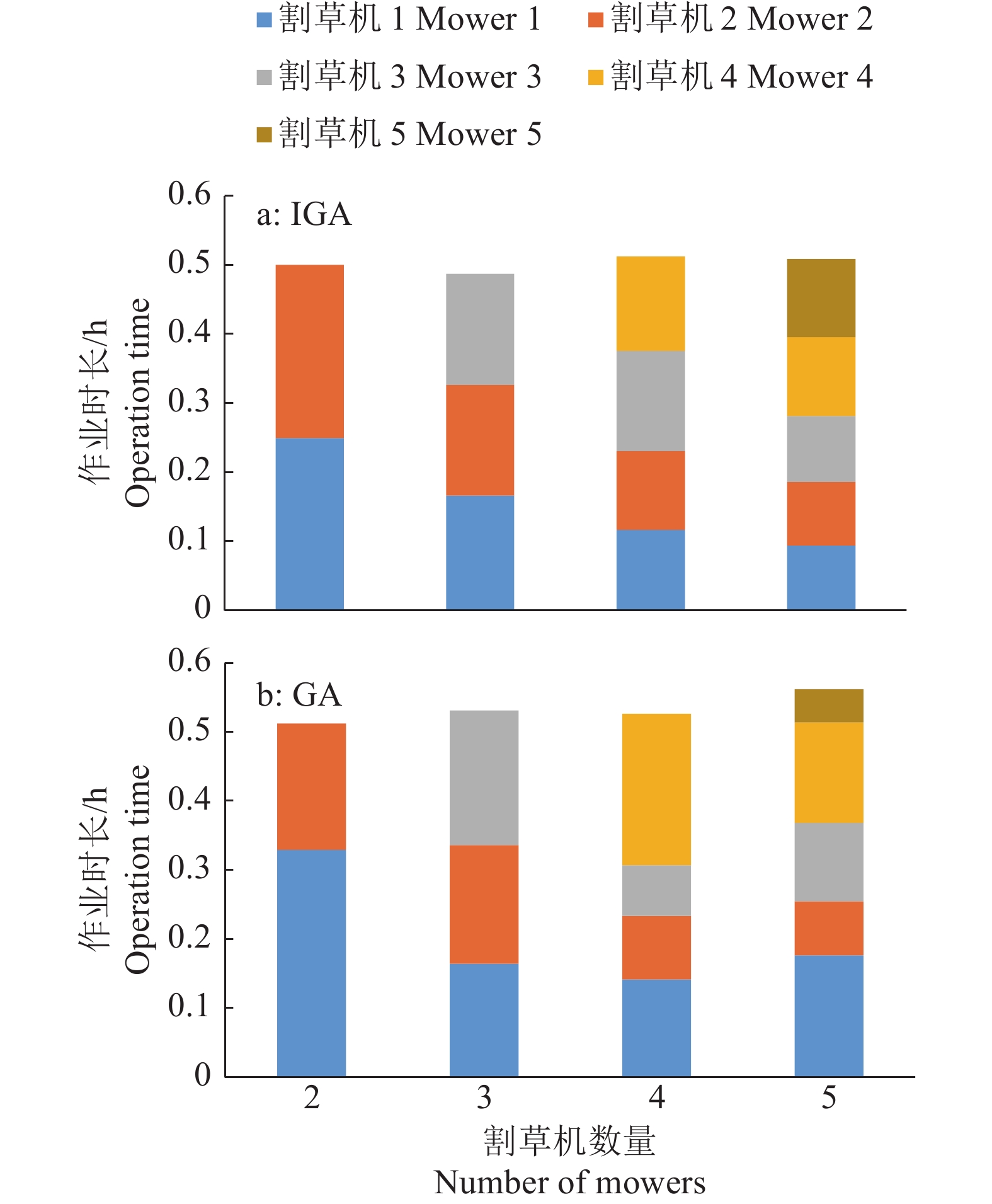 Method An improved genetic algorithm (IGA) was proposed to assign and optimize the operating path for each mower. According to the actual operation of unmanned mowers, taking the total turning time and operation time as the comprehensive optimization goal, the optimization model for the operating path of multi-unmanned mower was constructed. In order to solve the model, the genetic algorithm (GA) was improved by setting task thresholds, introducing the improved circle algorithm and Metropolis criterion.
