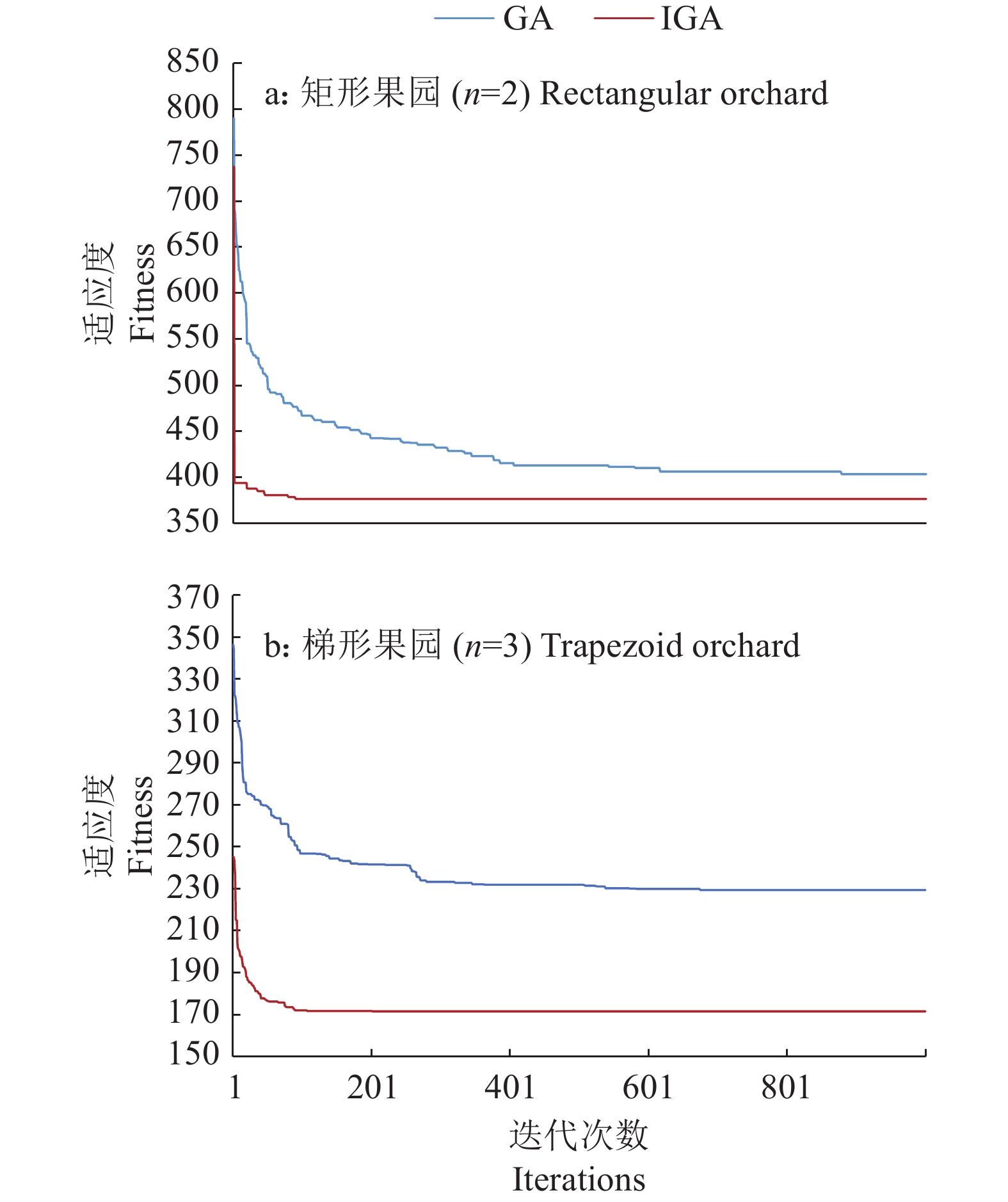 Result Simulation experiments results showed that the IGA balanced the workload assigned to each unmanned mower. Compared with GA, the path optimized by IGA resulted in an average reduction of 22.89% and 19.36% in the total turning time and operation time, respectively, in the rectangular orchard. Compared with the partition operation, the total turning time and operation time of the path optimized by IGA were reduced by an average of 45.53% and 10.68%, respectively, in the rectangular orchard. In the trapezoidal orchard, IGA was not affected by the distribution of fruit trees. Compared with GA and partition operation, the average value of total turning time reduced by 14.38% and 34.08%, respectively, while the average value of operation time reduced by 23.71% and 10.07%, respectively.