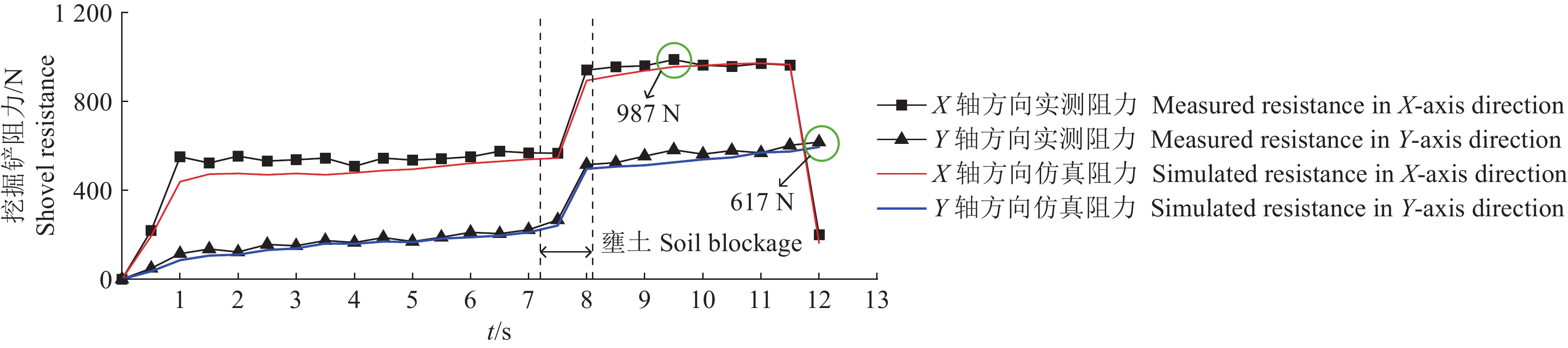 结果 对回归模型进行寻优,得到仿真标定的土壤颗粒间JKR表面能、恢复系数、静摩擦系数和动摩擦系数的最优值分别为14.88 J/m2、0.53、0.46和0.150,标定的土壤−65Mn板间JKR表面能、恢复系数、静摩擦系数和动摩擦系数的最优值分别为7.02 J/m2、0.59、0.57和0.058。通过三七挖掘铲仿真试验与土槽试验对比分析得到,挖掘铲受XY轴方向平均阻力仿真值与实测值相对误差分别为9.91%、8.78%。