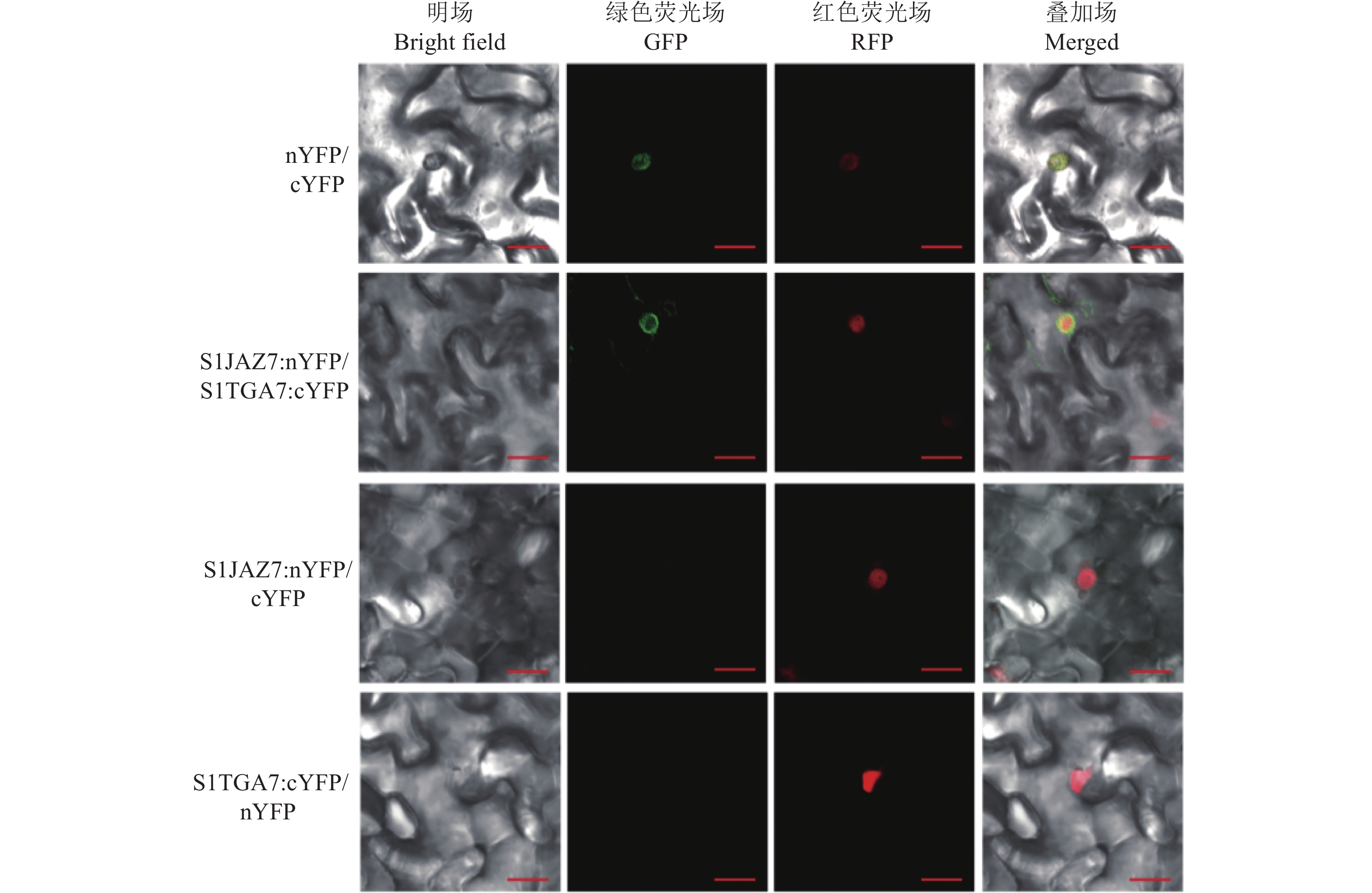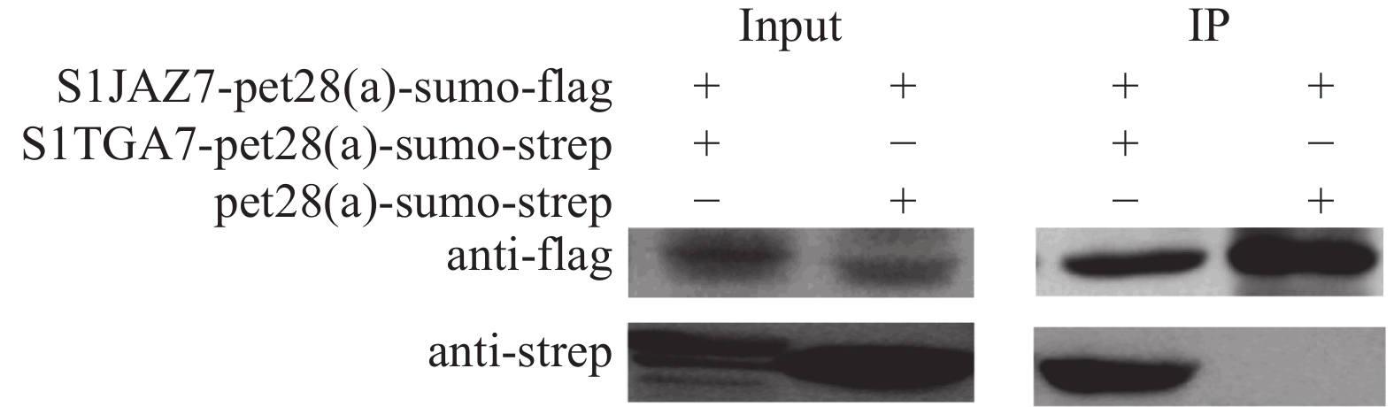 Result Transgenic tomato leaves overexpressing SlJAZ7 gene had lower peroxidation damage than wild type when treated with pathogens, the expression level of SlTGA7 in transgenic lines increased. SlJAZ7 gene was highly expressed in nutrient tissues. SlJAZ7 gene was induced by Pst DC3000 and in response to MeJA and SA treatments. SlTGA7 gene showed opposite change trend under the same treatment. Both SlJAZ7 and SlTGA7 proteins were located in the nucleus. All Y2H, BiFC and pull down experiments proved the interaction between SlJAZ7 and SlTGA7.